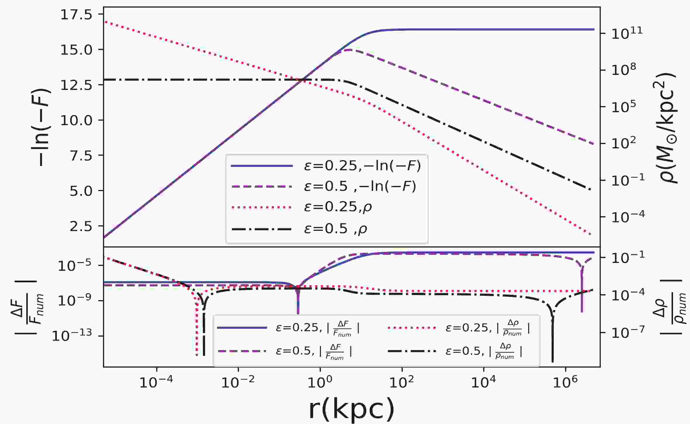 Figure 1.  (color online) Comparison results between the approximate analysis and numerical solutions. (top) The analytical solutions of $ -\ln(-F) $ and $ \rho $. The solid and dashed lines represent $ -\ln(-F) $ when $ \epsilon $ = 0.25 and 0.5, respectively. The dotted and dashed-dotted lines represent $ \rho $ when $ \epsilon $ = 0.25 and 0.5, respectively. (bottom) The relative errors ($\mid\dfrac{\Delta F}{F_{\rm num}}\mid = \mid\dfrac{ F_{\rm num}-F_{\rm app}}{F_{\rm num}}\mid$ and $ \mid\dfrac{\Delta \rho}{\rho_{num}}\mid = \mid\dfrac{ \rho_{\rm num}-\rho_{\rm app}}{\rho_{\rm num}}\mid $) for different $ \epsilon $. The subscripts $ {\rm num} $ and $ {\rm app} $ refer to quantities relating to the numerical solutions and approximate analysis, respectively. The solid and dashed linescorrespond to $ \mid\dfrac{\Delta F}{F_{\rm num}}\mid $ when $ \epsilon $ = 0.25 and 0.5, respectively. The dotted and dashed-dotted lines give $ \mid\dfrac{\Delta \rho}{\rho_{num}}\mid $ when $ \epsilon $ = 0.25 and 0.5, respectively.
