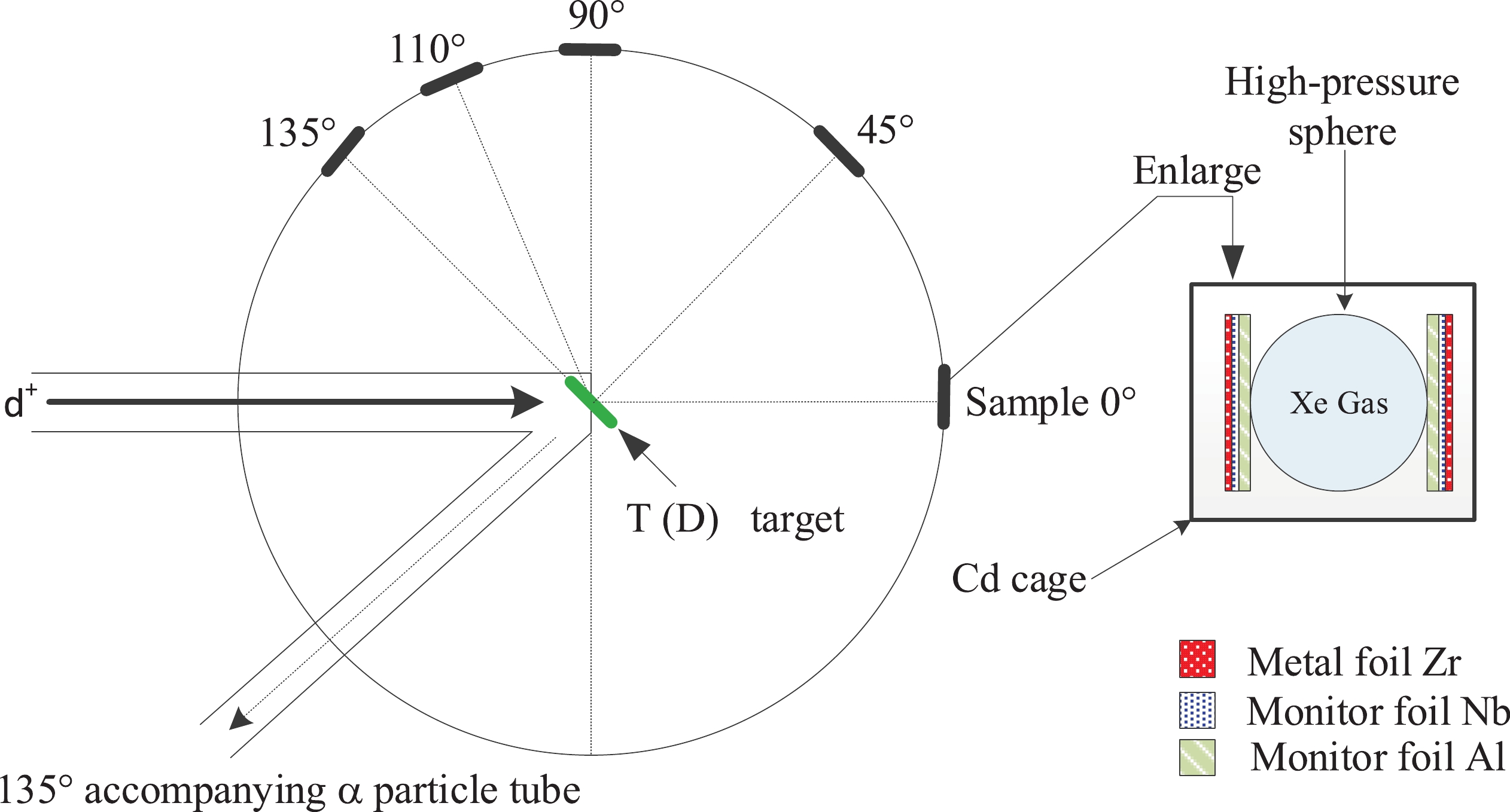 Xenon gas (99.999% purity with natural isotopic composition) was stored in a stainless-steel sphere with a 20 mm inner diameter and 1 mm wall thickness. The xenon gas weight was obtained by subtracting the container weight from the total weight. The gas weight and pressure were 2.3–5.2 g and 120–250 atm, respectively. Five of such samples of xenon gas and 10 monitors (20 mm diameter), comprising 99.99% pure and 0.12 mm thick Nb foil and a 99.999% pure and 0.3 mm thick Al foil, were prepared for irradiation. A ZrNbAl–Xe–AlNbZr stack was prepared from these five samples and mounted at 0°, 45°, 90°, 110°, and 135° angles relative to the beam. The end of the neutron production target was 5 cm apart from the sample sphere center (see Fig. 1). The neutron fluxes for the low-threshold of the 130Xe(n, p)130I, 131Xe(n, p)131I, and 132Xe(n, p)132I reactons were monitored by implementing the 27Al(n, α)24Na reaction (Eth = 3.249 MeV). The neutron fluxes for the high-threshold of the 124Xe(n, 2n)123Xe, 126Xe(n, 2n)125Xe, 128Xe(n, 2n)127Xe, 130Xe(n, 2n)129mXe, and 132Xe(n, 2n)131mXe reactions were monitored by implementing the 93Nb(n, 2n)92mNb reaction cross-section (Eth = 8.792 MeV). The cross-sections of the 27Al(n, α)24Na and 93Nb(n, 2n)92mNb monitor reactions were adopted from a different paper [24]. Subsequently, a cadmium foil (99.95% pure and 1 mm thick) was wrapped around the samples to minimize the influence of the 124Xe(n, γ)125Xe, 126Xe(n, γ)127Xe, 128Xe(n, γ)129mXe, and 130Xe(n, γ)131mXe reactions activated via thermal neutrons on the 126Xe(n, 2n)125Xe, 128Xe(n, 2n)127Xe, 130Xe(n, 2n)129mXe, and 132Xe(n, 2n)131mXe reactions, respectively.