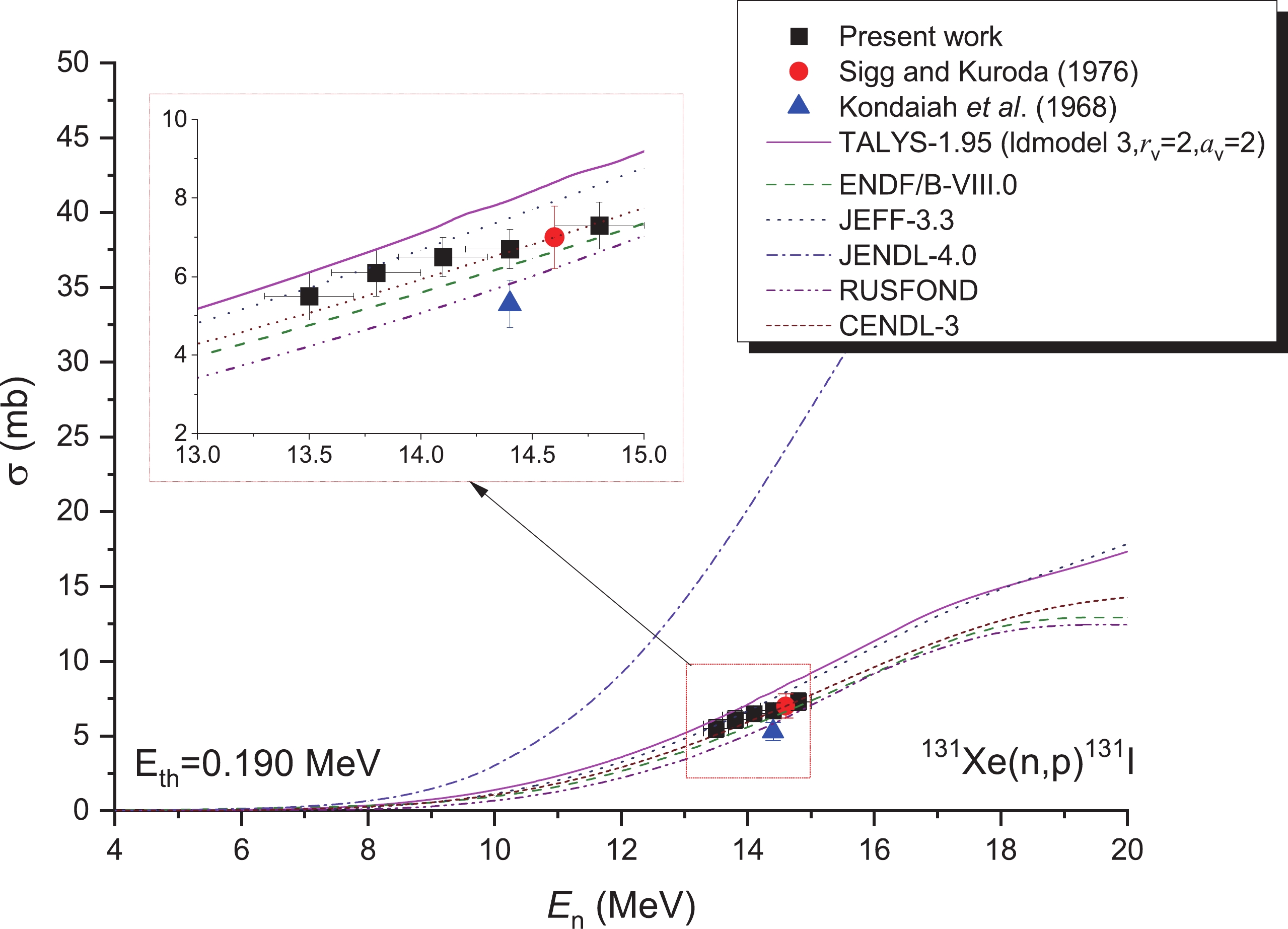 For the 131Xe(n,p)131I reaction, the following conditions were adopted for the measurements: gamma-rays at 364.49 keV (Iγ = 81.5%) emitted via 131I (half-life, T1/2 = 8.0252 d). The measurements reported in the literature adopt the same decay data as this work. Figure 10 compares our data with those of the and literature [10, 11], together with the data obtained by TALYS-1.95 and from the JENDL-4.0 [15], ENDF/B-VIII.0 [16], CENDL-3 [17], JEFF-3.3 [18], and RUSFOND [19] libraries. The agreement between these data is the best at the 13–15 MeV range (see Fig. 10), despite the lack of experimental data at an early stage. Within the neutron energy rage of 13.5–14.8 MeV, our values agree well with the experimental data obtained in [10] and with the evaluated data obtained from the CENDL-3 [17] libraries, within the limits of experimental uncertainty. However, all of our data are below those of JENDL-4.0 [15] (refer to Fig. 10), and the result of the JENDL-4.0 database [15] was 4 times that of ENDF/B-VIII.0 [16], JEFF-3.3 [18], RUSFOND [19], and CENDL-3 [17]. For the theoretical calculation of the 131Xe(n, p)131I reaction, although the OMP parameters rv and av, as well as the level densities, were adjusted to 2, 2, and ld-model 3, respectively, the results remain slightly higher than those obtained in the present study and the evaluated data obtained from the ENDF/B-VIII.0 [16], CENDL-3 [17], JEFF-3.3 [18], and RUSFOND [19] libraries.