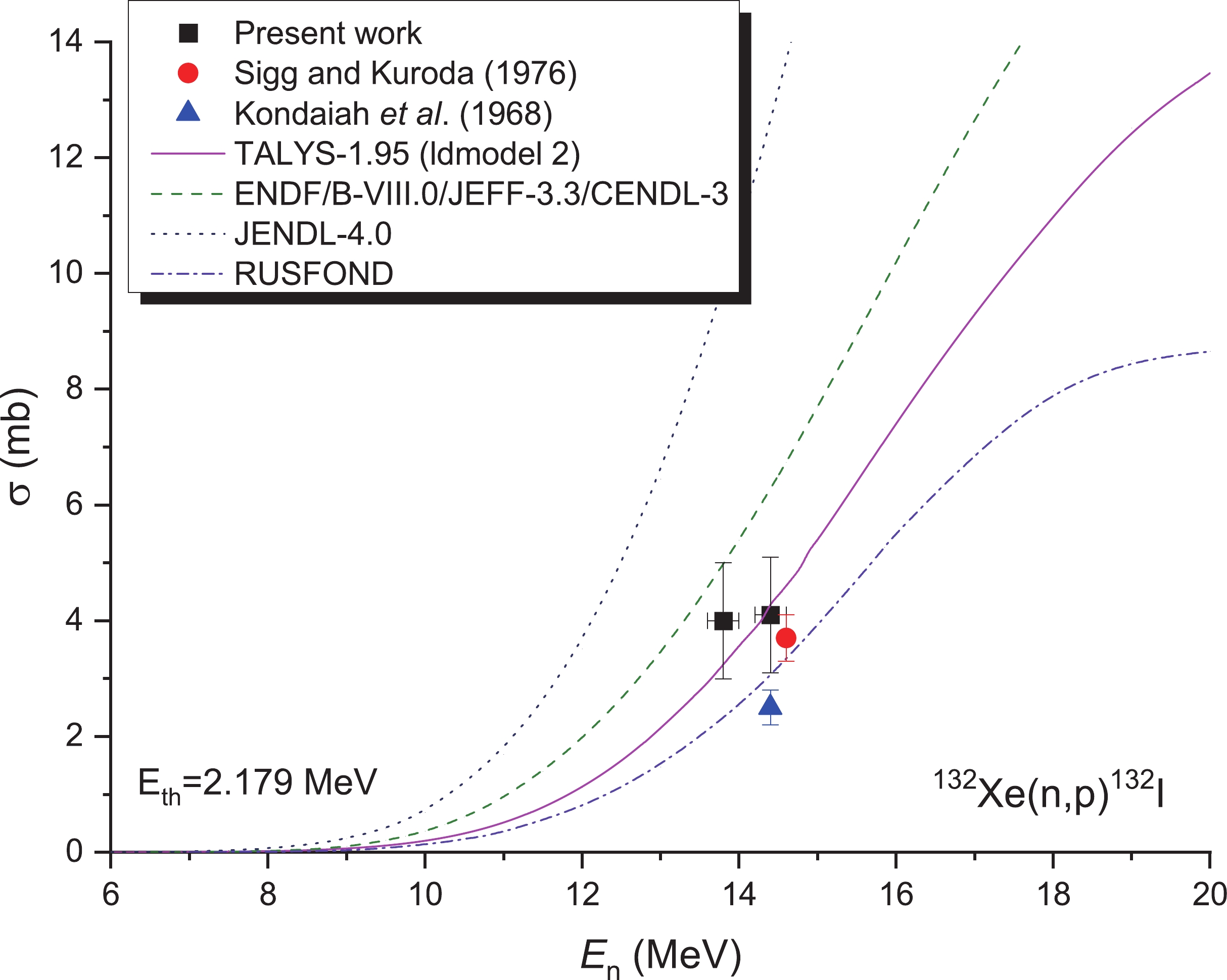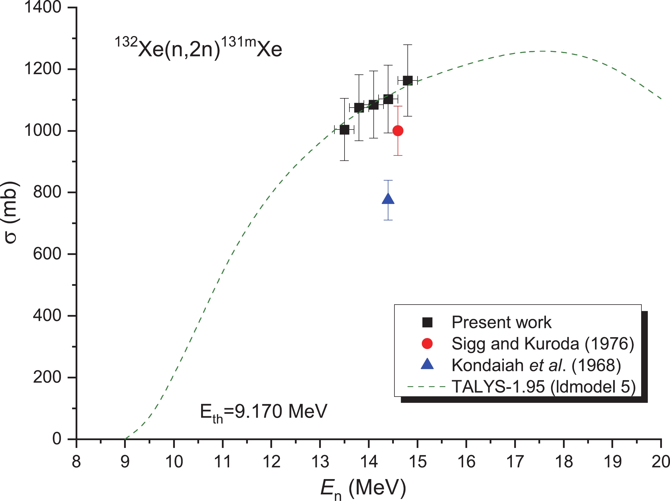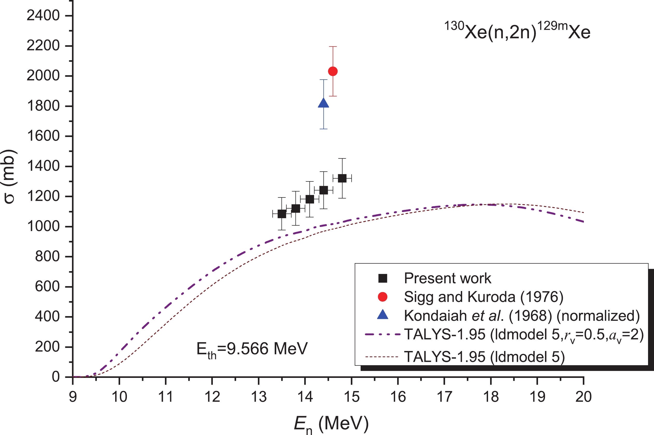 For the 124Xe(n, 2n)123Xe reaction, the gamma-ray with an intensity of Iγ=48.9% and 148.9 keV emitted in the decay of 123Xe was utilized to obtain the cross-section of the 124Xe(n, 2n)123Xe reaction. Sigg and Kuroda [10] used Iγ=63.9% while Kondaiah et al. [11] used Iγ=47.3% for the same ray. However, studies demonstrate that the obtained data for Iγ=48.9% exhibits higher measuring accurately. Accordingly, the cross-sections are modified as follows: