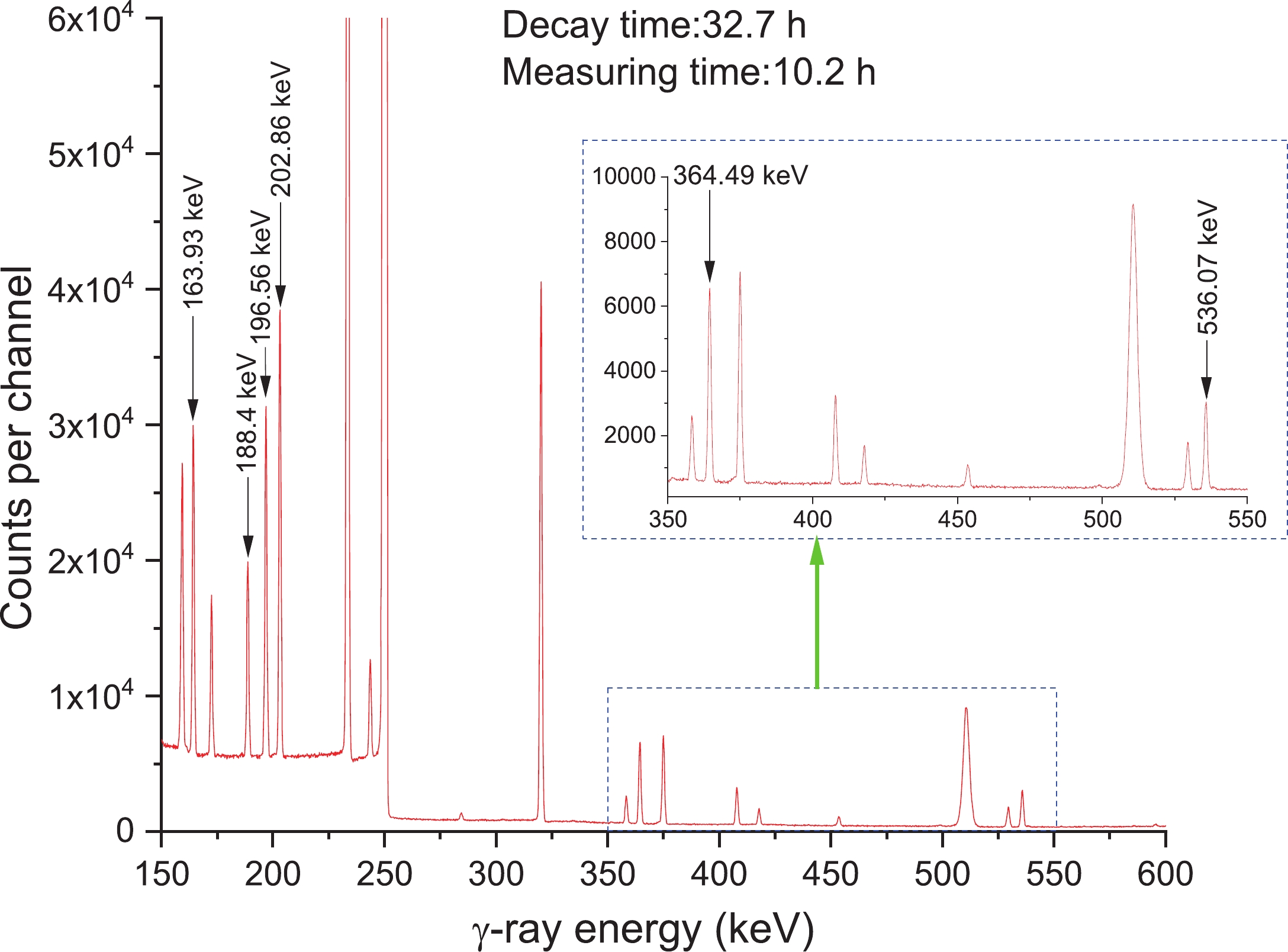 Figure 3. (color online) γ-ray spectrum of xenon obtained with a 68% relative efficient HPGe detector at En=14.8 MeV, 32.7 h after the neutron activation of xenon isotopes, and an acquisition time of 10.2 h. The lines of interest are 188.4, 202.86, 163.93, 196.56, and 364.49 keV. In the energy ranges of 350–550 keV, the enlarged portion of the spectrum is given.