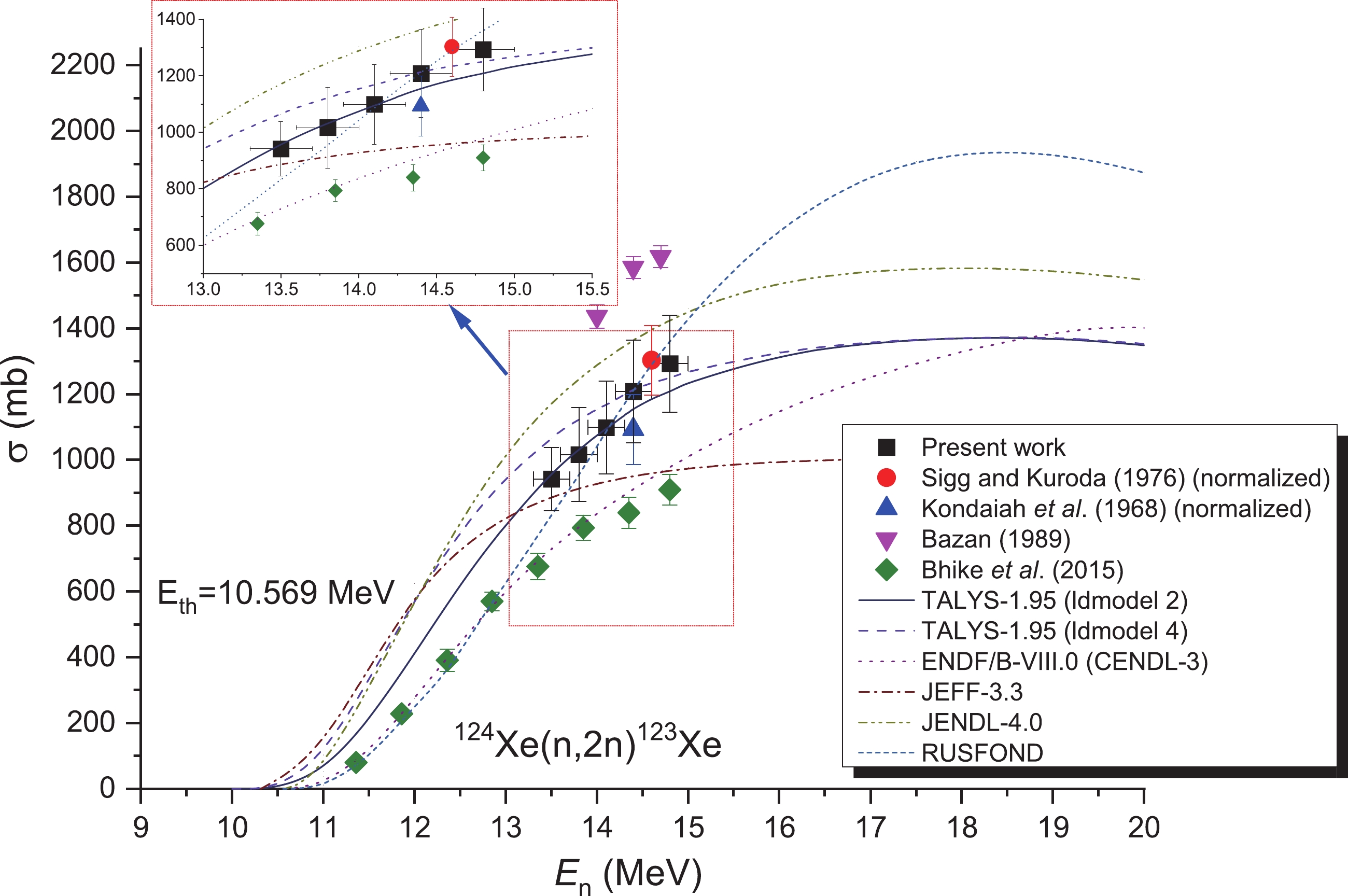 (10) where σliterature is the literature cross-section, Iγ(old) represents the corresponding intensity of the 148.9 keV gamma-ray in the literature, and Iγ(new) is 48.9%. Consequently, the divergence of the four evaluation curves given by databases JENDL-4.0 [15], ENDF/B-VIII.0 [16], CENDL-3 [17], JEFF-3.3 [18], and RUSFOND [19] is very obvious (ENDF/B-VIII.0 [16] is the same as CENDL-3 [17]). The evaluation result of database JENDL-4.0 [15] was 1.5 times that of ENDF/B-VIII.0 [16] (CENDL-3 [17]). The evaluation curves of the ENDF/B-VIII.0 [16] and CENDL-3 [17] data libraries were approximately similar to the simulated curves of excitation processed using TALYS-1.95 [20] (refer to Fig. 4). The results obtained from our measurements increase upon increasing the neutron energy in the 14 MeV range, similar to the theoretical and evaluation data. However, some differences were still observed between the results of earlier experiments. Only four laboratories have reported neutron-induced experimental cross-sections regarding the reaction of 124Xe(n, 2n)123Xe [10–13]. In the 13–15 MeV neutron region of energy, the results obtained in our study are consistent (within the experimental uncertainties) with those obtained by the TALYS-1.95 code (ldmodel 2: The back-shifted Fermi-gas model), with those obtained from the RUSFOND [19] assessments, and with the values reported by Sigg and Kuroda [10] and Kondaiah et al. [11]. In addition, the evaluated data obtained from JENDL-4.0 [15] and Bazan [12] exhibited larger cross-sections than those obtained from the TALYS-1.95 code (ldmodels 2 and 4), ENDF/B-VIII.0 [16] and CENDL-3 [17] assessments, and the study by Bhike et al. [13].
