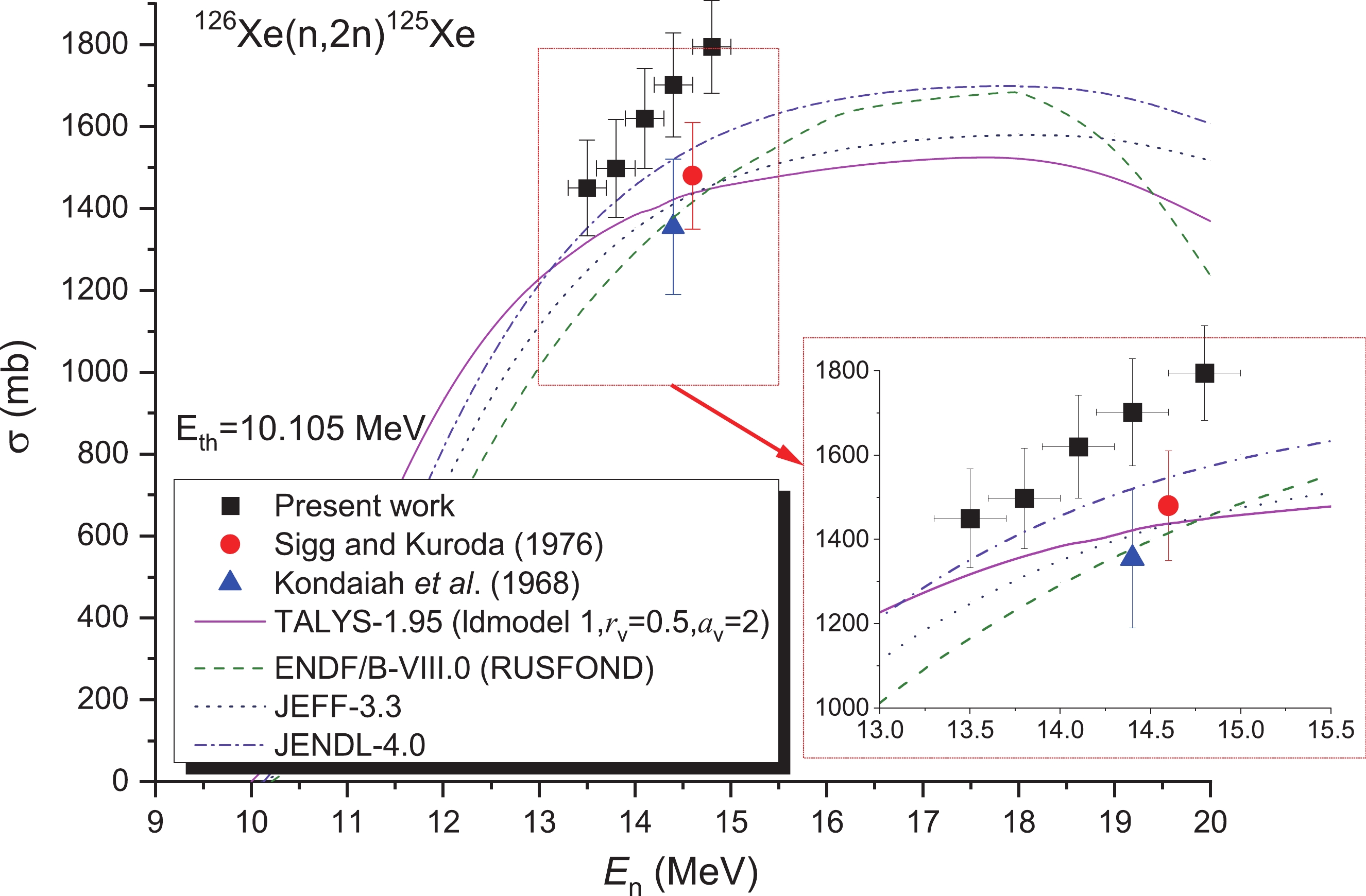 Owing to the lack of data and differences between these data, the libraries of evaluated nuclear data rely heavily on nuclear model calculations in the 13–15 MeV energy regions; hence, large differences exist among the various evaluations. For instance, for the 124Xe(n, 2n)123Xe reaction, the evaluation result of database JENDL-4.0 [15] was 1.5 times that of ENDF/B-VIII.0 [16] (CENDL-3 [17]). For the 130Xe(n, p)130I reaction, the result of database JENDL-4.0 [15] was 3 times that of ENDF/B-VIII.0 [16] (JEFF-3.3 [18], RUSFOND [19]). For the 131Xe(n, p)131I reaction, the result of database JENDL-4.0 [15] was 4 times that of ENDF/B-VIII.0 [16], JEFF-3.3 [18], RUSFOND [19], and CENDL-3 [17]. For the 132Xe(n, p)132I reaction, the result of database JENDL-4.0 [15] was 4 times that of RUSFOND [19]. Consequently, new measurements for the Xe(n,x) cross section are required in the 13–15 MeV neutron energy range.