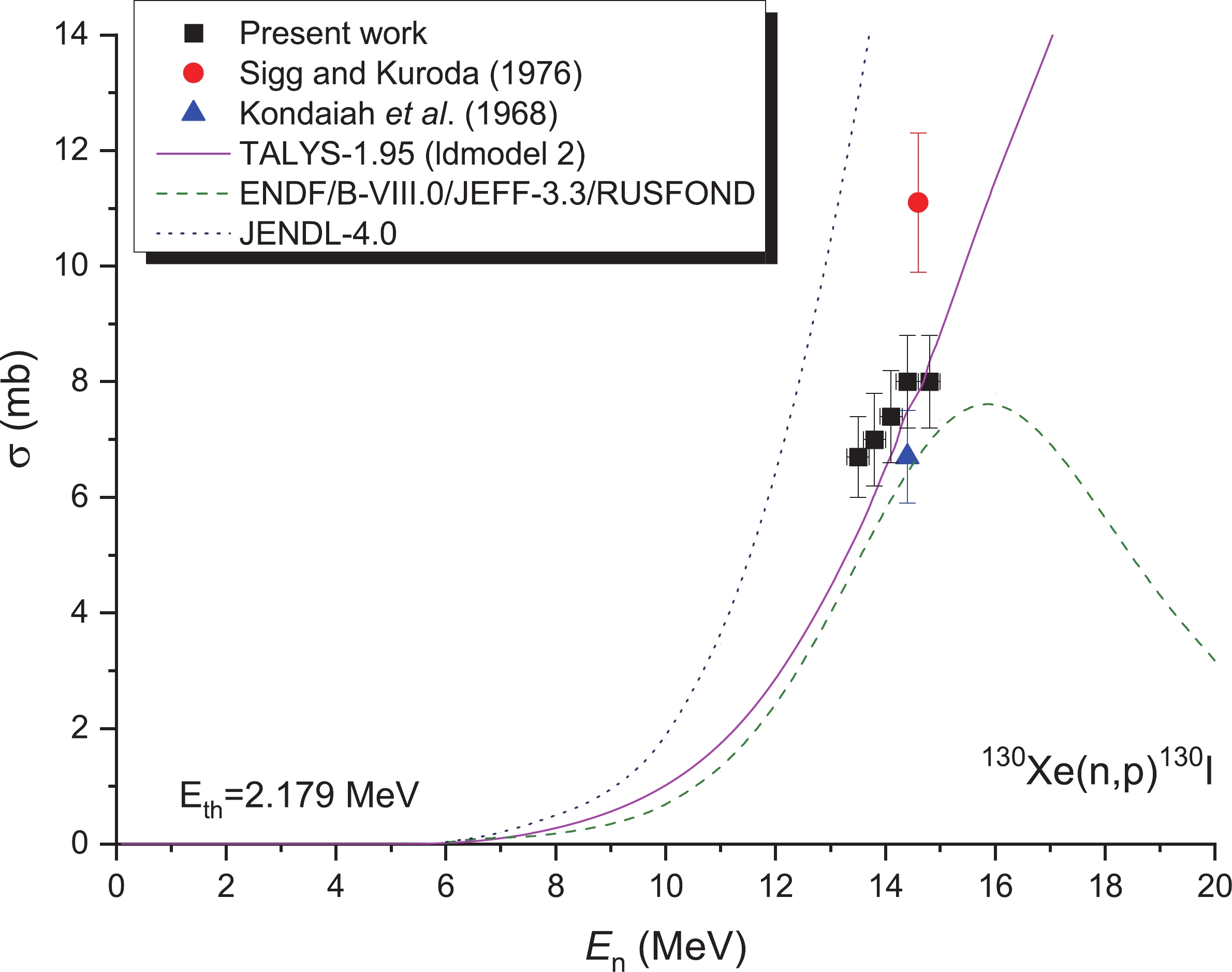 Figure 9 presents the cross sections of the 130Xe(n,p)130I reaction based on the results reported in [10,11]. In Fig. 9, the values obtained using the TALYS-1.95 calculations and the data obtained from the ENDF/B-VIII.0 [16] (JEFF-3.3 [18] and RUSFOND [19]) and JENDL-4.0 [15] libraries are represented in continuous lines. As illustrated in Fig. 9, there are significant dissimilarities among the results obtained from TALYS-1.95 [20], including the evaluation values acquired using JENDL-4.0 [15] at a neutron energy of approximately 14 MeV. The values evaluated by the JENDL-4.0 [15] for the 130Xe(n, p)130I reaction are 3 times higher those assessed by ENDF/B-VIII.0 [16], JEFF-3.3 [18], and RUSFOND [19] at a neutron energy of approximately 14 MeV. Above the 15 MeV neutron energy, in addition to becoming significantly larger, the difference between the two evaluation curves also changes in the opposite direction. The main reason for this phenomenon is the lack of necessary experimental data. Furthermore, the present result is consistent with the results reported in [11] within the limits of experimental uncertainties. At the 14.8 MeV energy point, the results obtained by Sigg and Kuroda [10] were 40% higher than those measured in this study.
