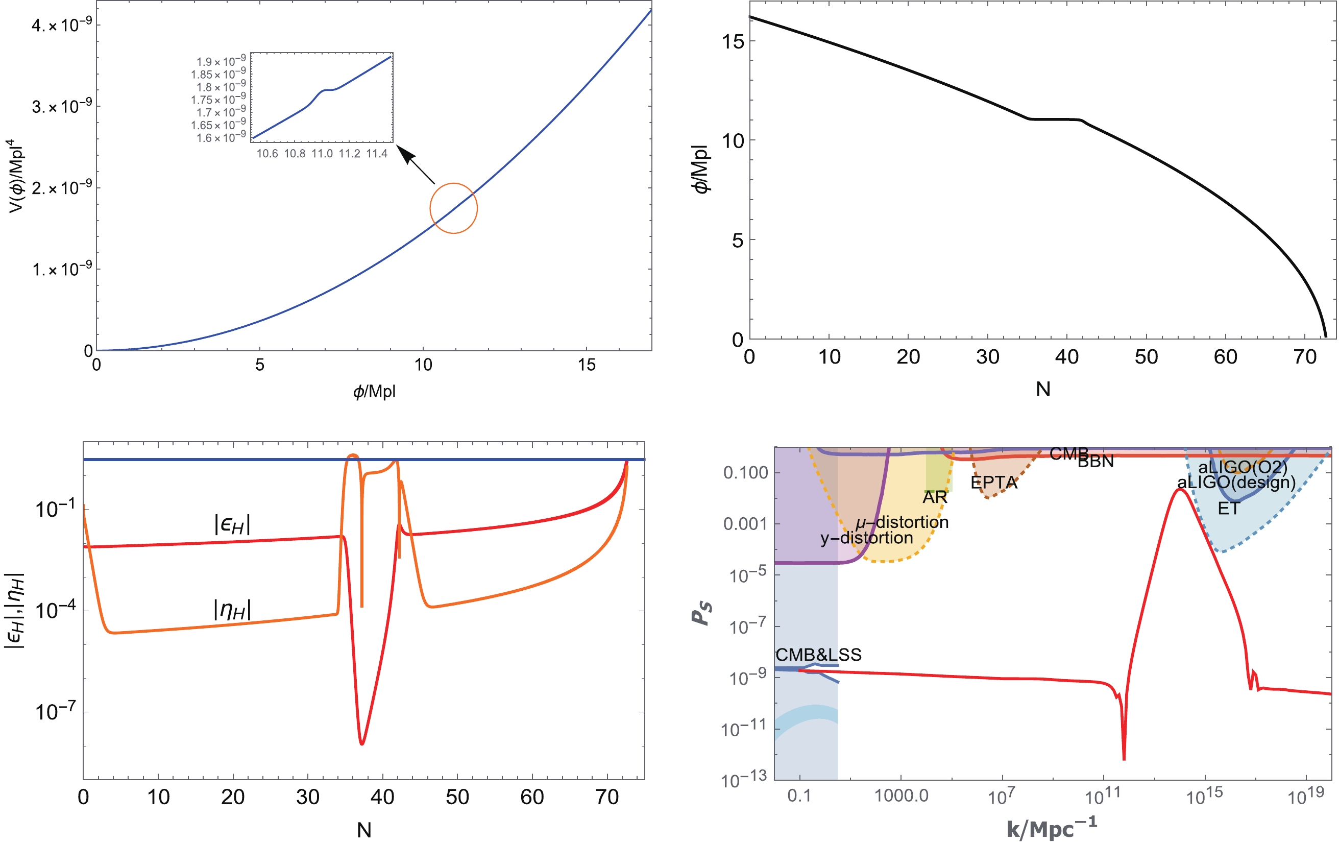 Figure 1. (color online) Upper left figure: the inflation potential of