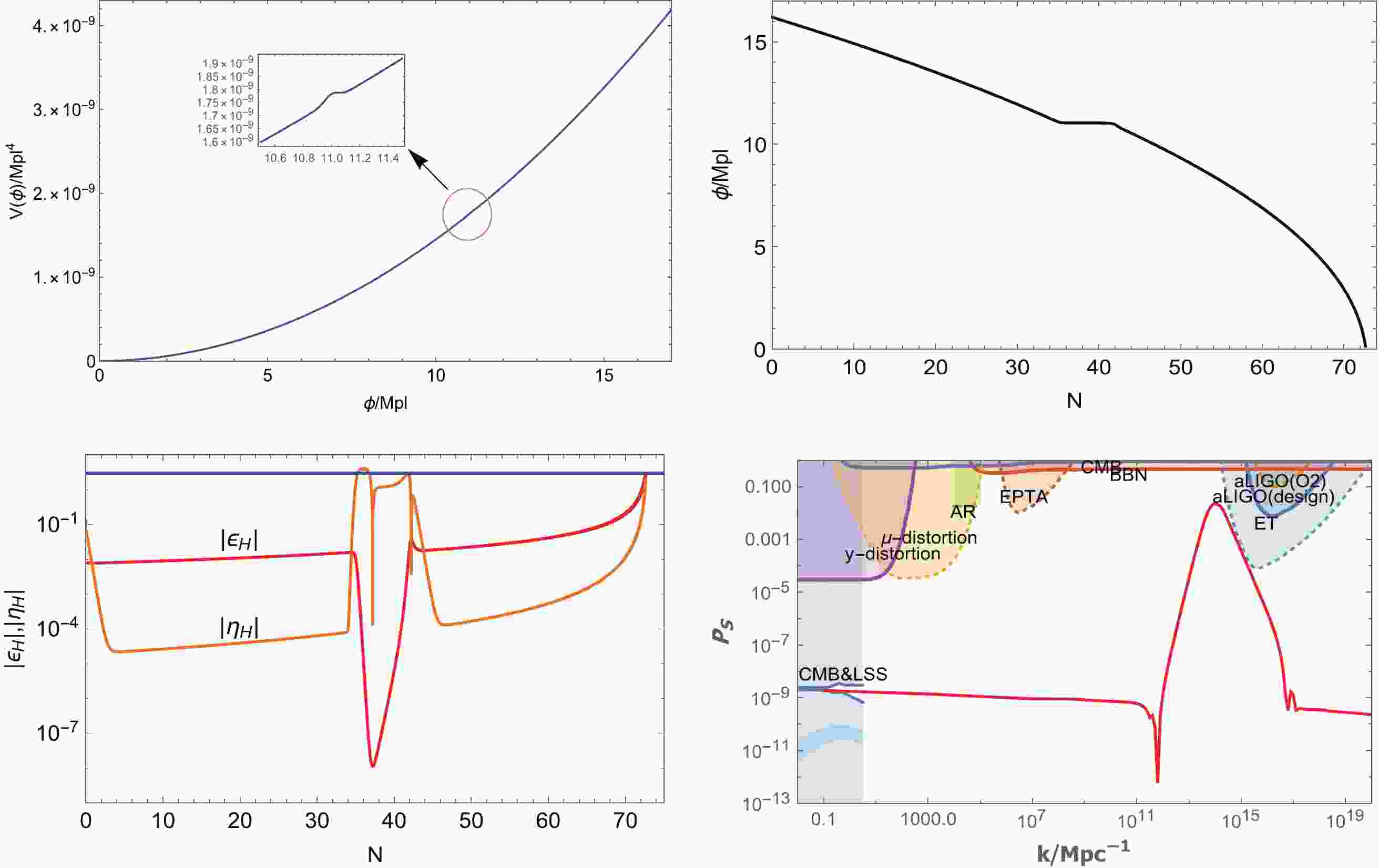 $ p = 2 $ , in which the bump is located at$ \phi = 11M_{pl} $ . Upper right figure: the evolution of ϕ with the parameter N, which enters the USR-like stage near$ N = 40 $ . Lower left figure: the evolution of the slow roll parameters$ |\epsilon_{H}| $ and$ |\eta_{H}| $ , in which the blue line corresponds to the value of 3 on the vertical axis. Lower right figure: the relationship between the power spectrum$ P_{S} $ (in Logarithmic scale) and the wave-number k. Our results are consistent with the observational constraints.$\begin{aligned}[b]&V_{0} = 1.45\times 10^{-11}M_{pl}^{4},\quad p = 2,\quad b = 1.5718\times 10^{-2},\\& \quad \quad \quad \quad c = 11M_{pl},\quad d = 5\times 10^{-3}M_{pl}^{2}\; . \end{aligned} $