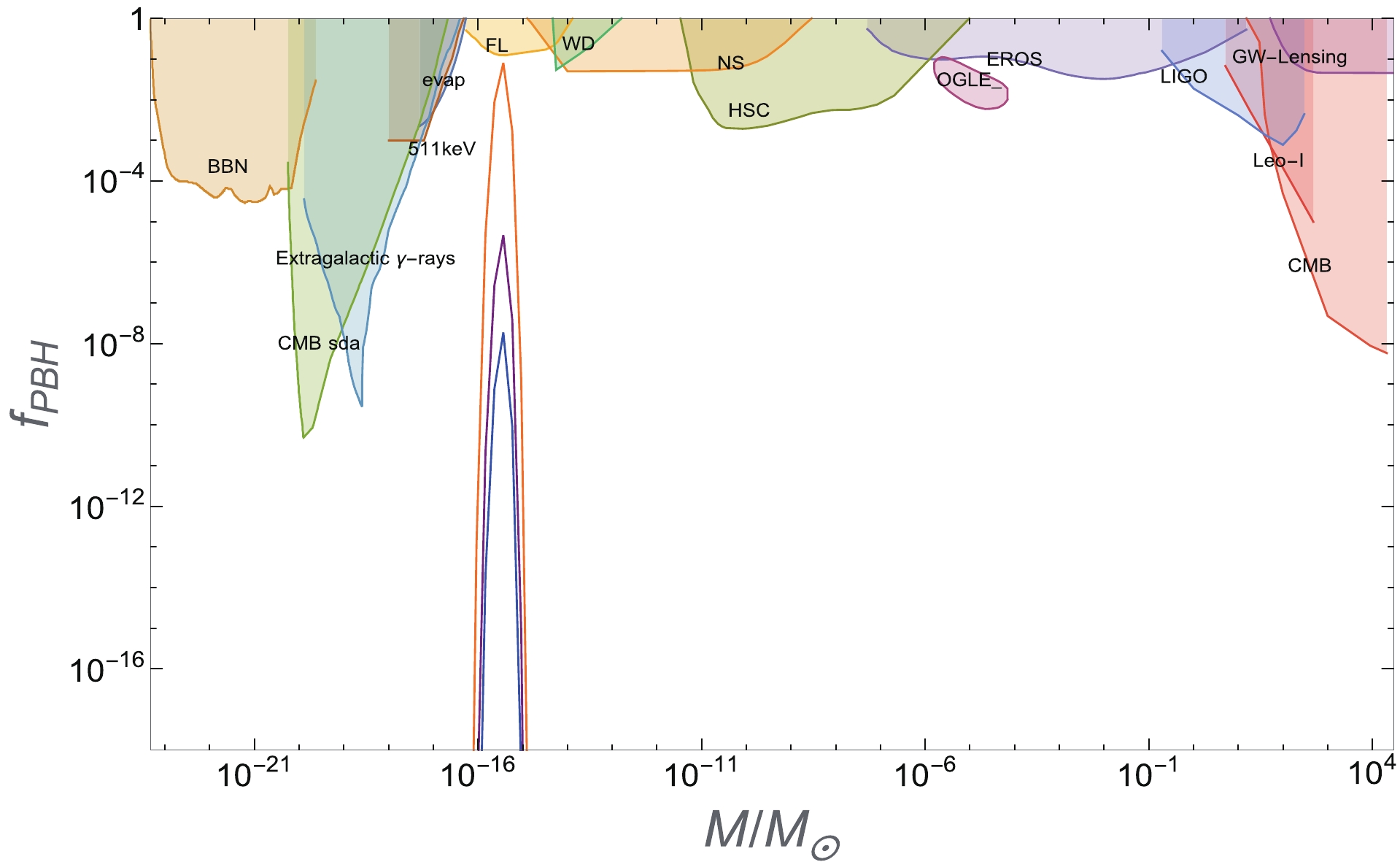 Figure 5. (color online) The figures above show the constraints on primordial black holes acting as dark matter, in which the colored region is excluded by various observations. The blue lines correspond to