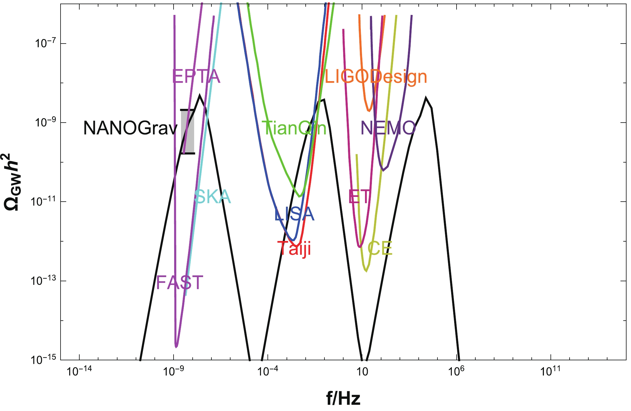 Figure 7. (color online) The energy spectra of scalar-induced GWs from multi-bumpy potential. The dashed region represents observational constraints by the NANOGrav data [125]. The colored lines are designed sensitivity curves of current and future gravitational wave detectors including FAST [126], SKA [127], EPTA [128], TianQin [129], LISA [130], Taiji [131], NEMO [132], Einstein Telescope(ET) [133], Cosmic Explorer (CE) [134], LIGO Design [135].