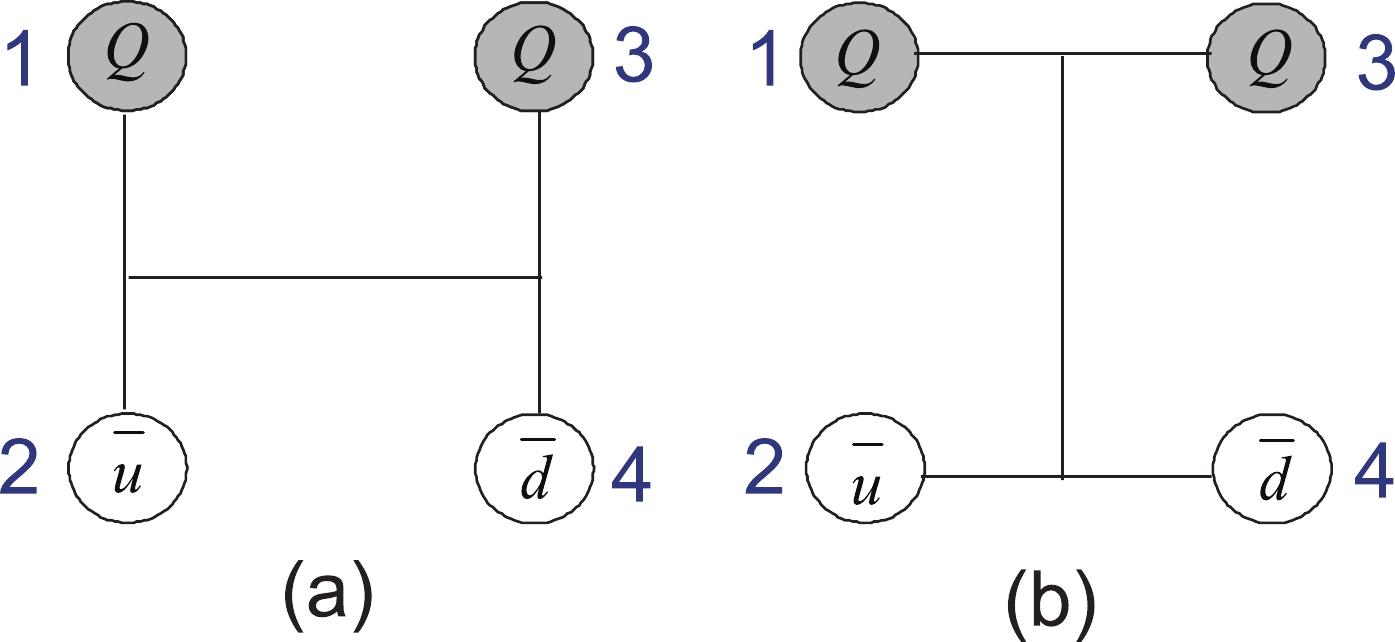 $ T_{QQ}\; (Q = c, b) $ . Figure (a) represents the meson–meson structure; figure (b) is the diquark–antidiquark structure.The wave functions of tetraquark states should be a product of spin, flavor, color and space degrees of freedom. For the spin component, we denote α and β as the spin-up and spin-down states of quarks, and the spin wave functions for the two-quark system are