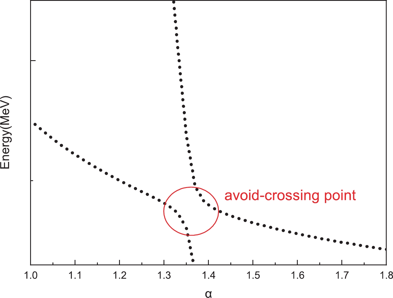 $ T_{QQ} $ . To find the genuine resonances, the dedicated real scaling (stabilization) method is employed. In our previous work [76], this method was used successfully to explain the$ Z_{cs}(3985) $ observed by the BESIII collaboration [77]. To realize the real scaling method in our calculation, we need to multiply by a factor α the Gaussian size parameter$ r_n $ in Eq. (19) just for the meson–meson structure with color singlet–singlet configuration. In our calculation, α takes values from 1.0 to 3.0. With the increase of α, all states will fall off towards their thresholds, but bound states should be stable and resonances will appear as an avoid-crossing structure as in Fig. 2 [78]. In the figure, at the avoid-crossing structure, there are two lines. The upper line is a scattering state with larger slope, which will fall down to the threshold. The lower line represents the resonance state, which tries to keep stable with a smaller slope. When the resonance state and the scattering state interact with each other, this brings about an avoid-crossing point as in Fig. 2. With the increase of the scaling factor α, the energy of the other higher scattering state will fall down, will interact with this resonance state again and another avoid-crossing point will emerge. In our work, we set the number of repetitions of avoid-crossing points to 2, owing to the large amount of computation required. Theoretically speaking, with the continuous increase of α, avoid-crossing points will appear in succession. Then we have found a resonance state. For bound states, with the increase of α, they always stay stable. We show the results for the$ T_{QQ} $ system with all possible quantum numbers in Figs. 3–10 by considering the complete channel couplings.