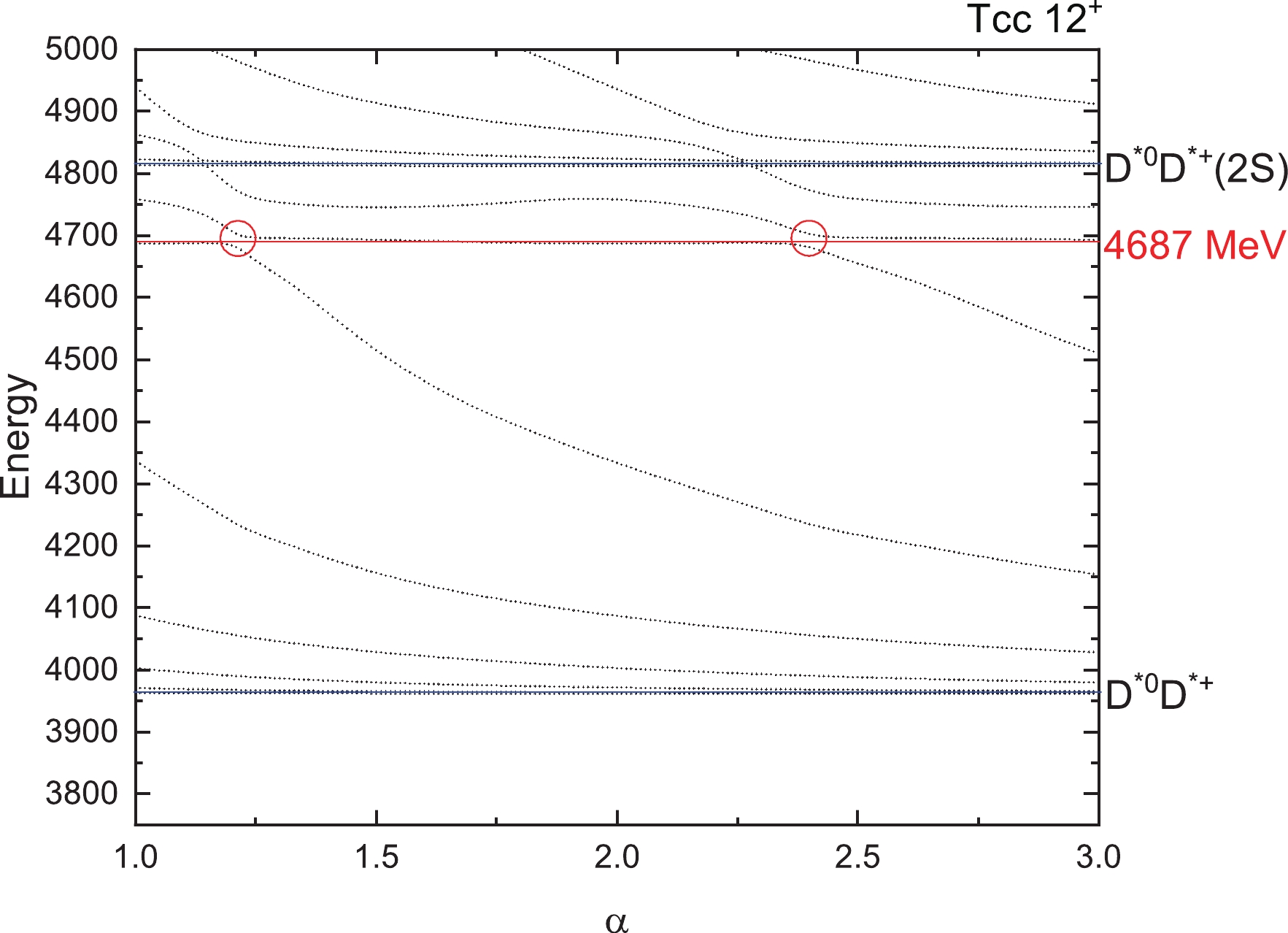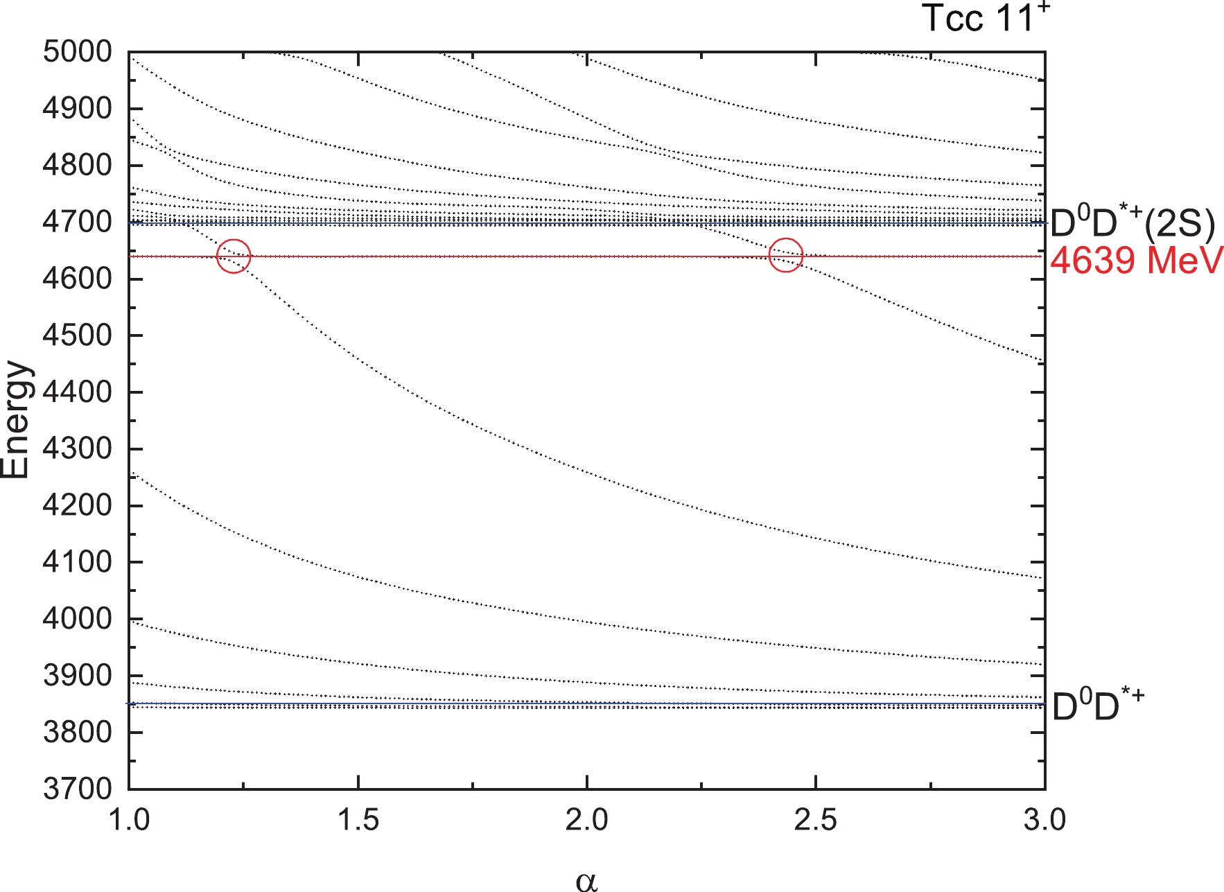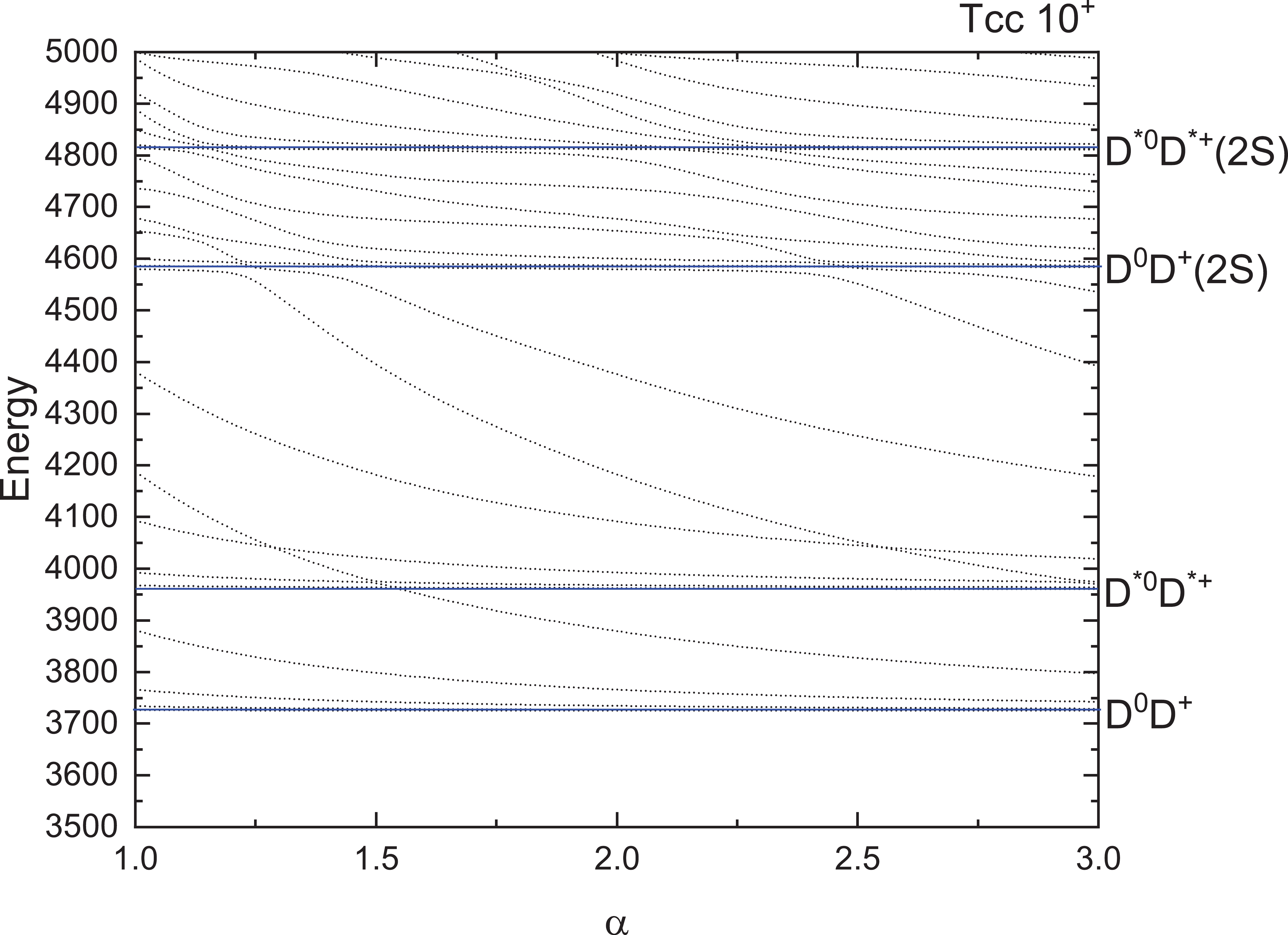 $ T_{cc} $ states for$ 1(0^+) $ . The four horizontal blue lines are the thresholds of$ D^0D^+ (0 \otimes $ $ 0 \rightarrow 0) $ ,$ D^{*0}D^{*+} (1 \otimes 1 \rightarrow 0) $ and their excited states$ D^0D^+(2S) $ and$ D^{*0}D^{*+}(2S) $ . Higher energies are not listed here. We found no resonances for this state. From Fig. 4, two thresholds$ D^0D^{*+} $ and its excited states$ D^0D^{*+}(2S) $ appear clearly. Around an energy of 4639 MeV, we found the avoid-crossing phenomenon, which represents a genuine resonance state. In Fig. 5, we can see that the energy of the lowest resonance state is about 4687 MeV for$ T_{cc} $ with$ 1(2^+) $ . For iso-scalar$ T_{cc} $ with$ 0(1^+) $ , a bound state with mass 3660 MeV is obtained and the lowest resonance state shows with a stable energy of 4304 MeV in Fig. 6.For iso-vector and iso-scalar