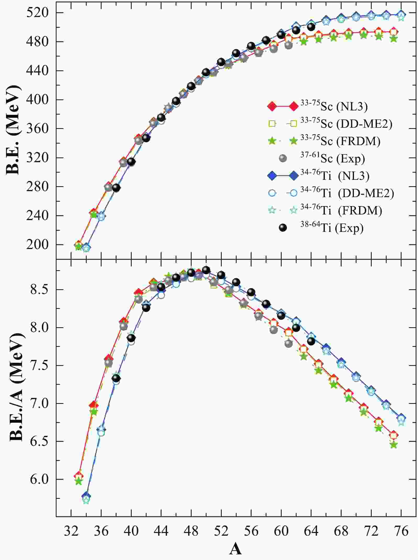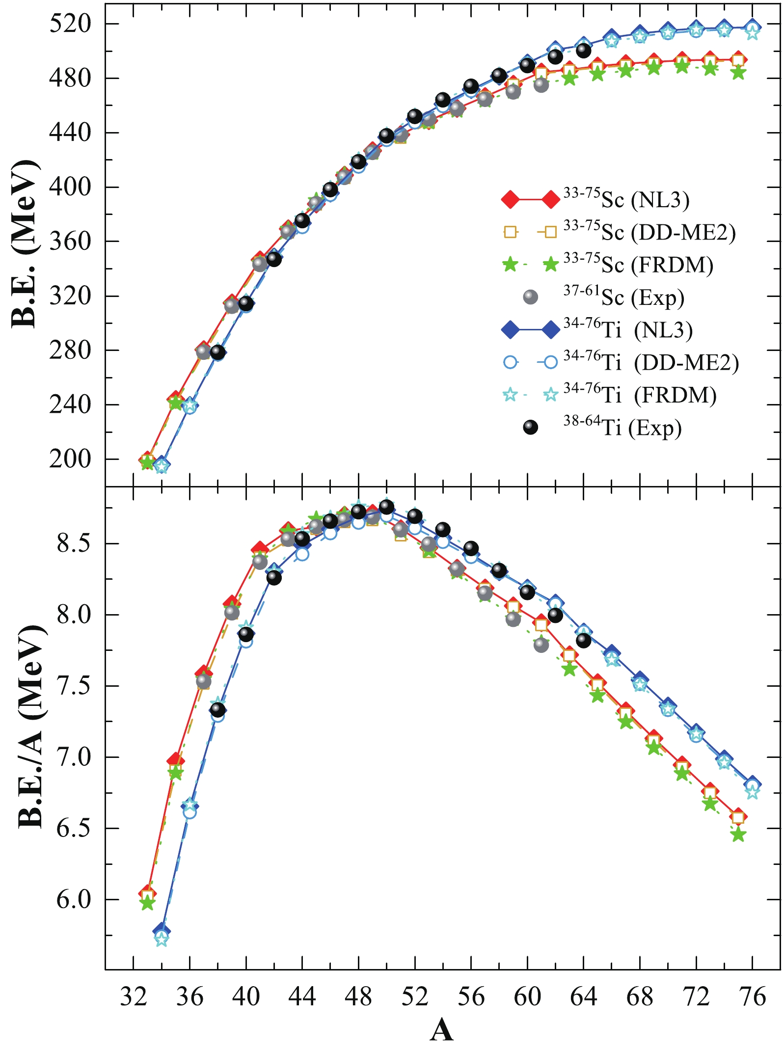 $ B.E. $ ) and binding energy per nucleon ($ B.E./A $ ) from the non-linear NL3 and density-dependent DD-ME2 interactions for the Sc and Ti isotopic chains as a function of mass number (A) are shown in the upper and lower panels, respectively. The FRDM predictions [116] and available experimental data [117] are given for comparison.Nucleus Binding energy Charge radius Quadrupole deformation Pairing energy NL3 DD-ME2 FRDM