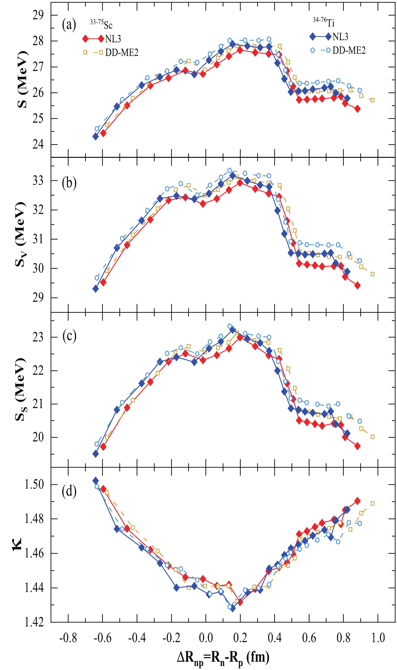 $ \Delta R_{np} $ in the finite nuclear system. Furthermore, recent studies (Ref. [66] and the reference therein) have shown the correlation of neutron-skin thickness with the surface properties of nuclei and the emergence of kinks at shell/sub-shell closure over an isotopic chain. We show the symmetry energy and its components, namely the volume and surface symmetry energy, along with their ratio κ as a function of neutron skin thickness ($ \Delta R_{np} $ ) for the Sc- and Ti- isotopic chains using the NL3 and DD-ME2 parameter sets in Fig. 10 (a), (b), (c), and (d). Note that the value of symmetry energy decreases with neutron number in either direction of the magic or semi-magic number on the isotopic chain. For example, we find a kink (depth) at N = 20, 28, 34, and 50 for the symmetry energy and its components over the isotopic chains of the Sc- and Ti- nuclei for both parameter sets, which further strengthens the above predictions. The appearance of a kink over an isotopic chain shows that the energy required to convert one proton-to-neutron is significantly greater for the shell or sub-shell closure isotope than its neighboring nuclei.