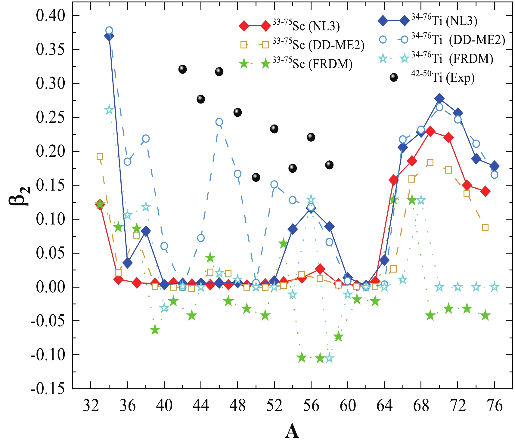 $ \beta_{2} $ is calculated from the RMF of the NL3 and relativistic-Hartree-Bogoliubov DD-ME2 parameter sets for the isotopic chains of Sc- and Ti- nuclei. In Fig. 2, we show$ \beta_{2} $ as a function of neutron number for the odd-A Scandium and even-even Titanium isotopic chains using both parameter sets along with the FRDM predictions [116] and experimental data [120]. In Fig. 2, we notice that the quadrupole deformation for the NL3 parameter set and FRDM predictions underestimate the experimental data, wherever available. In contrast, the DD-ME2 parameter estimate is close to the experimental data, except for a few isotopes of the Ti-nuclei. A miniature oblate configuration is observed for a few isotopes of the Ti- and Sc- nuclei for the DD-ME2 parameter set and FRDM predictions, whereas no such shape is found for the NL3 case. Moreover, we note a shape transition from spherical to prolate near$ N \geq $ 44 for the Scandium and near$ N \geq $ 40 for the Titanium isotopic chains in both the NL3 and DD-ME2 parameter sets. It is important to note that theoretical ground state quadrupole deformation is primarily characterized by shape fluctuations, which present quadrupole moment effectiveness as insignificant [121]. Moreover, in many Sc- and Ti- nuclei, which are not (axially) well-deformed, experimental quadrupole deformation estimated from the experimental B(E2, 2+$ \rightarrow $ 0+) values assuming a rotational formula is ineffective. These calculations are only provided so that readers may obtain a firsthand comparison-based idea regarding the degrees of freedom of the shapes of these nuclei. -