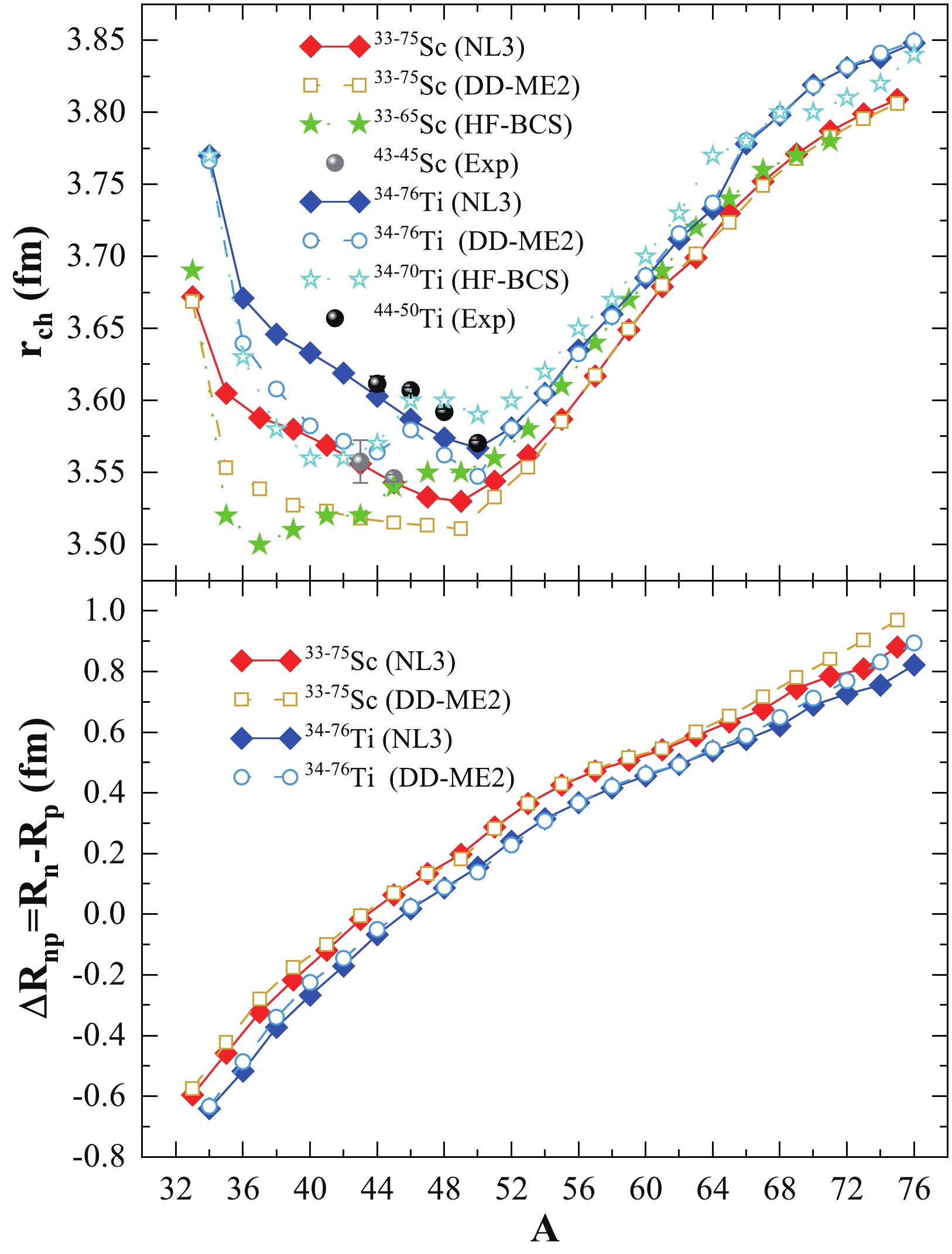 $ r_{\rm ch} $ and neutron-skin thickness$ \Delta R_{np} $ from the NL3 and DD-ME2 interactions as a function of mass number (A) for the Sc and Ti isotopic chains. The Hartree–Fock+Bardeen–Cooper–Schrieffer (HF-BCS) predictions [97] and available experimental data [119] are given for comparison.The neutron-skin thickness of a nucleus is defined as the difference between the rms radius of the neutrons and protons inside the nucleus and is expressed as