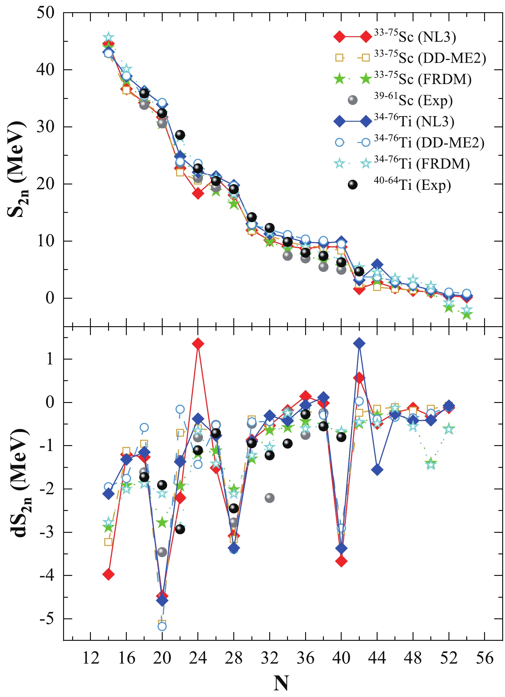 $ B.E. (N, Z) $ and$ B.E. (N-2, Z) $ nuclei are calculated using the non-linear NL3 and density-dependent DD-ME2 interaction parameters. To correctly estimate the nucleon separation energy$ S_{ {2n}} $ , it is necessary to predict precise mass measurements. In the top panel of Fig. 4, we compare the$ S_{ {2n}} $ as a function of neutron number of the odd-A isotopes of Scandium (Z = 21) and even-even isotopes of Titanium (Z = 22) nuclei for both parameters. The FRDM predictions [116] and latest experimental data [117] are also given for comparison. In Fig. 4, it can be observed that in an isotopic chain,$ S_{ {2n}} $ decreases with increasing neutron number. A few significant kinks appear at the neutron magic numbers N = 20, 28, and 40, as well as an inconsequential observation at N = 50, for both isotopic chains within the NL3 and DD-ME2 parameter sets. These kinks in the$ S_{ {2n}} $ values justify the stability of the nucleus, that is, the energy required for the removal of two neutrons from a nucleus with the neutron number$ N_{\rm magic} \pm 2 $ is smaller in magnitude than the energy required for the removal of two neutrons from a nucleus associated with$ N_{\rm magic} $ . Here,$ N_{\rm magic} $ refers to a magic number configuration of neutrons.
