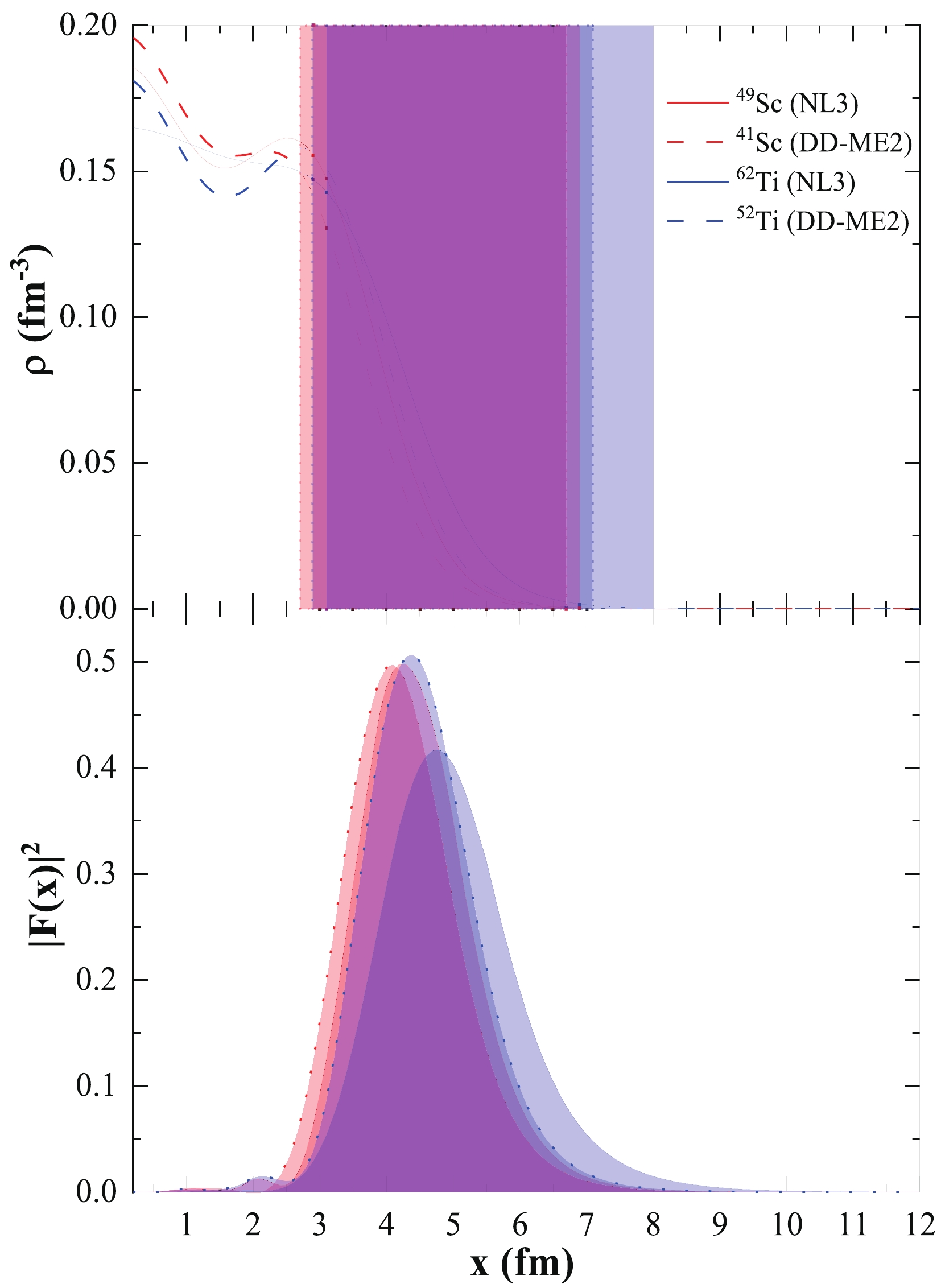 $ \vert {\cal{F}}(x) \vert^{2} $ in Eq. (8) has a bell-shaped form with a maximum value near$ x=R_{1/2} $ , where the density$ \rho (R_{1/2}) $ is approximately half the value of the central density$ \rho_{0} $ . In other words, the region surrounding$ \rho(R_{1/2}) = 0.5 \times \rho_{0} $ is nothing but the surface region of the nuclear matter density distribution. In principle, following Eq. (7), the integration limits are set from 0 to$ \infty $ . However, using the Brueckner energy density functional method, it is observed that symmetry energy has non-physical values in some regions. Hence, it is crucial to set proper limits on the integration, that is,$ x_{\rm min} $ and$ x_{\rm max} $ , where the symmetry energy at local density$ S^{NM}(x) $ changes from a negative to positive value and vice-versa, respectively. It must be noted that no point of$ S^{NM}(x) $ corresponding to a large x has been shown to change sign from positive to negative. Instead,$ S^{NM} (x) $ for large x tends to zero. Thus,$ x_{\rm max} $ is introduced in the right part of the weight function$ \vert {\cal{F}} (x) \vert^{2} $ , beyond which the contribution to symmetry energy (from$ x_{\rm max} $ to$ \infty $ ) is negligible. The estimated values of$ x_{\rm min} $ and$ x_{\rm max} $ for the specified isotopes of Sc- and Ti- for the NL3 (solid line) and DD-ME2 (dotted line) parameter sets are indicated by light red and light blue, respectively. It is worth mentioning that a considerable part of the weight functions attains a peak in the range corresponding to the surface region of the density distributions. This suggests the importance of the density surface contribution while calculating the symmetry energy; hence, these quantities are also known as surface properties. -