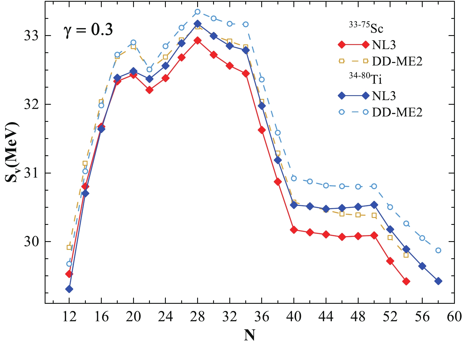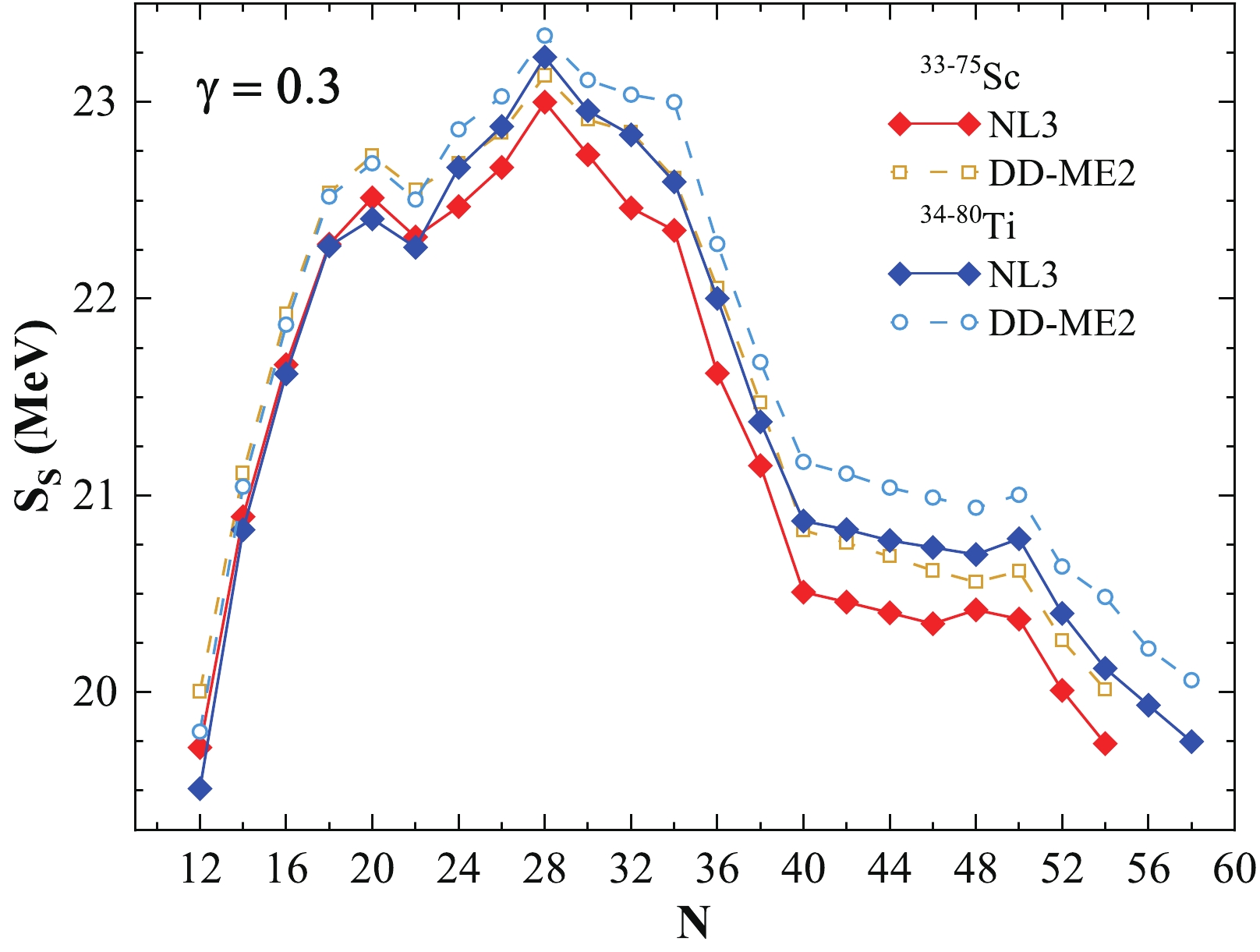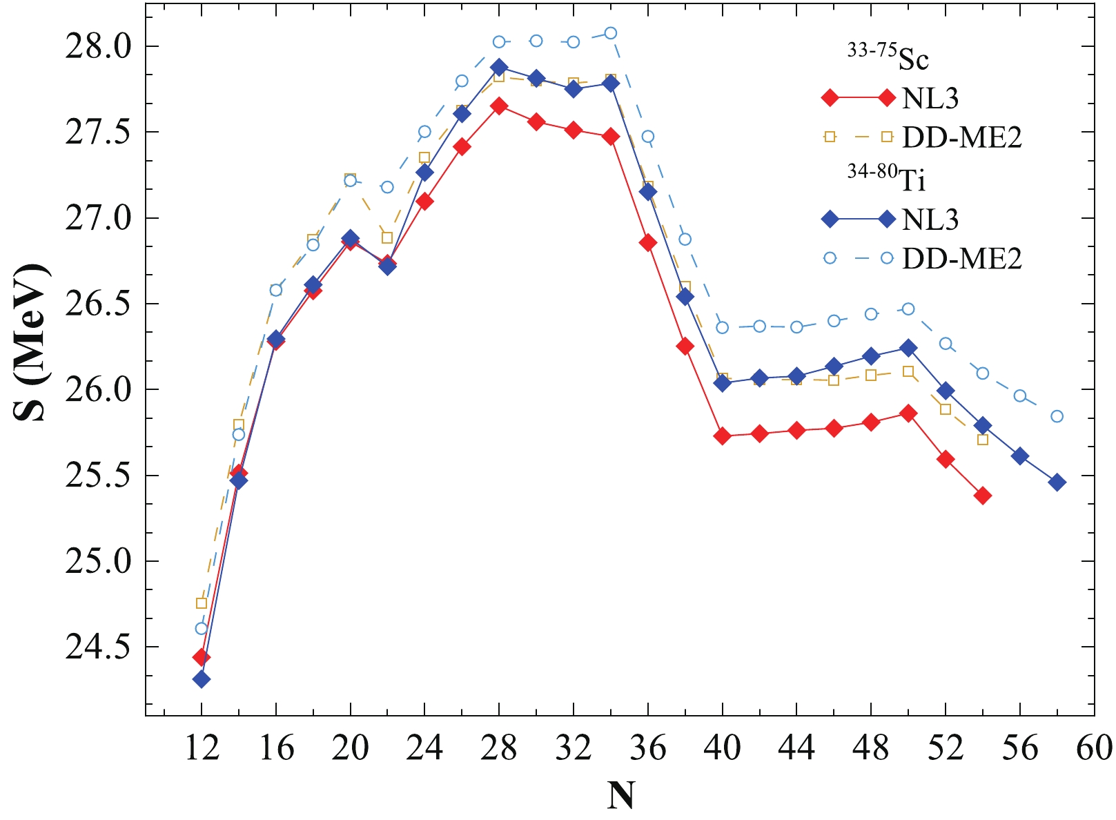 $ A^{-1/3} $ [74, 75]. Thus, the surface effects are significant for lighter nuclei and have little implication for larger mass nuclei. Taking deformations into account may provide better results. Recently, the effect of the deformation of finite nuclei on symmetry energy was reported using the theoretical Thomas–Fermi approximation over the Skyrme energy density functional [131], which highlights the effect of deformation on symmetry energy at local density decreasing with increasing mass number. Here, we also find that the relative change in symmetry energy is approximately 0.4 MeV for a relatively large value of$ \beta_{2} \approx 0.6 $ . Thus, we only consider the spherical densities of the isotopic chains of nuclei for computational ease in our calculations.The symmetry energy is calculated using Eq. (7) for the Sc- and Ti- isotopic chains with the non-linear NL3 and density-dependent DD-ME2 parameter sets. The results are shown in Fig. 6. As shown in the figure, numerous sharp discontinuities or kinks are observed at the neutron magic numbers corresponding to N = 20, 28, and 50, signifying shell/sub-shell closures for each isotopic chain. No signature of magicity are found for N = 40 on the isotopic chain of either nuclei. Relatively minor discontinuities are also observed at N = 34. These kinks indicate that these nuclei have higher stability at the magic neutron number than their surrounding isotopes in the corresponding isotopic chain of the nuclei. In other words, abnormalities observed in the symmetry energy curve suggest that additional energy would be needed to convert one neutron to a proton or vice versa. The symmetry energy S observed for the DD-ME2 parameter has a more consistently significant value than that of the NL3 parameter for both isotopic chains. Note that the nuclear matter symmetry energy for DD-ME2 typically has a higher magnitude than that for the NL3 parameter set. Hence, it shows that the surface contribution from DD-ME2 dominates the nuclear matter symmetry energy value in finite nuclei. As a result, we obtain a slightly more significant value of symmetry energy for DD-ME2 than NL3 for both isotopic chains at local density.