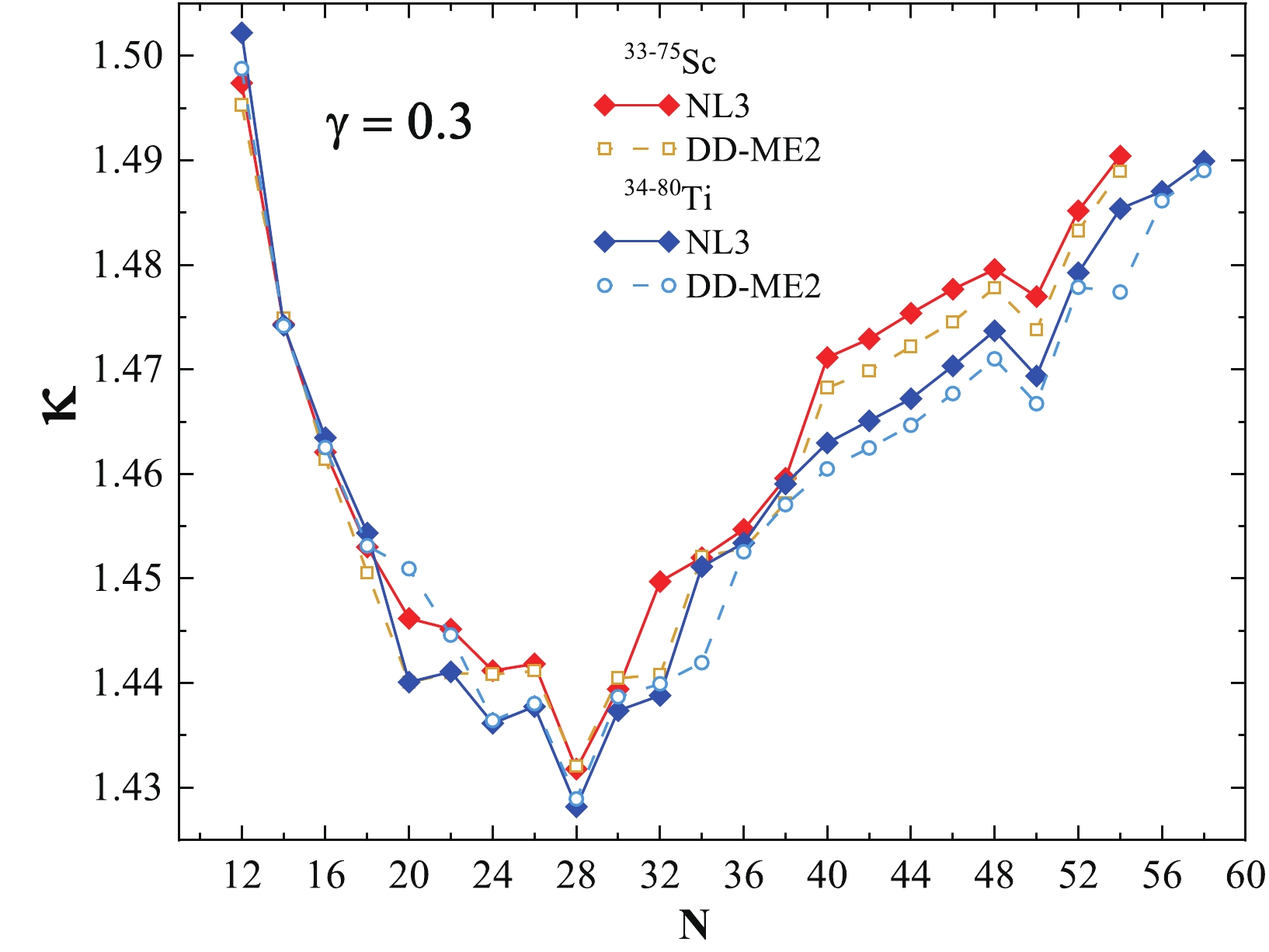 $ \gamma=0.3 $ (see Eq. (11)) because the conditions enforced on the analyzed quantities at T=0 MeV are consistent with the available empirical predictions [83, 112, 113]. For$ \gamma = 0.3 $ , the calculated values corresponding to (i) the NL3 parameter set yields a symmetry energy value of 24.4$ \le S \le 27.9 $ MeV, a volume symmetry energy value of 29.5$ \le S_{ {\rm V}} \le 33.2 $ MeV, and a surface symmetry energy value of 19.7$ \le S_{ {\rm S}} \le 23.2 $ MeV and (ii) the DD-ME2 parameter set provides a symmetry energy value of 24.3$ \le S \le 28.1 $ MeV, a volume symmetry energy value of 29.3$ \le S_{ {\rm V}} \le 33.4 $ MeV, and a surface symmetry energy value of 19.5$ \le S_{ {\rm S}} \le 23.4 $ MeV. The values obtained using$ \gamma = 0.3 $ for S,$ S_{ {\rm V}} $ , and$ S_{ {\rm S}} $ are consistent with the predictions in Ref. [83].Plots of the different components of symmetry energy, namely the volume symmetry energy, surface symmetry energy, and their ratio (κ), for Scandium and Titanium isotopes within the non-linear NL3 and density-dependent DD-ME2 parameter sets are given in Figs. 7, 8, and 9, respectively. In all three figures, we can infer that a few sharp discontinuities/kinks are observed at neutron numbers corresponding to the traditional magic numbers N = 20, 28, and 50. Limited evidence for the neutron magic number at N = 40 is observed for both isotopic chains within both parameter sets. A minor kink is also noticed at neutron number N = 34, which is relatively small in magnitude compared with the relative change at N = 20, 28, and 50. It is worth mentioning that N = 34 is an experimentally identified neutron shell/sub-shell closure for this region [25]. In addition, we calculate the ratio of volume symmetry energy and surface symmetry energy, denoted as κ, which follow nearly the same pattern exhibiting considerable depth at N = 20, 28, and 50. These dips in the ratio of volume symmetry energy to the surface component of symmetry energy are consistent with the observed kinks in the symmetry energy.