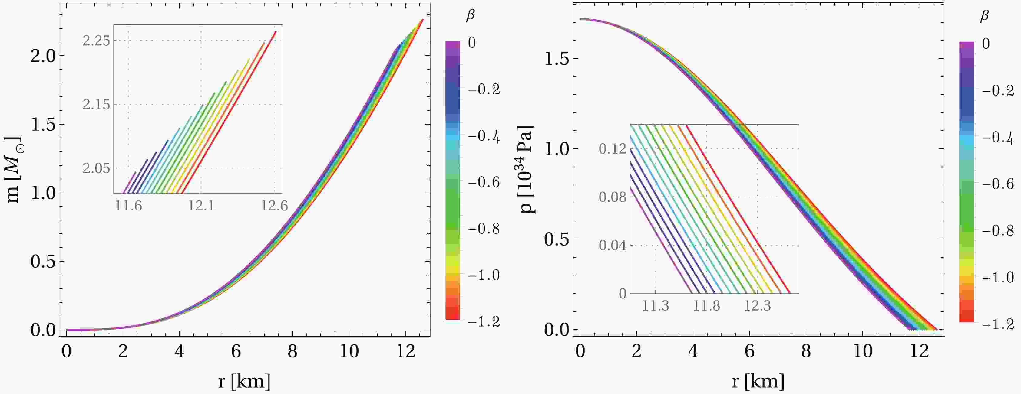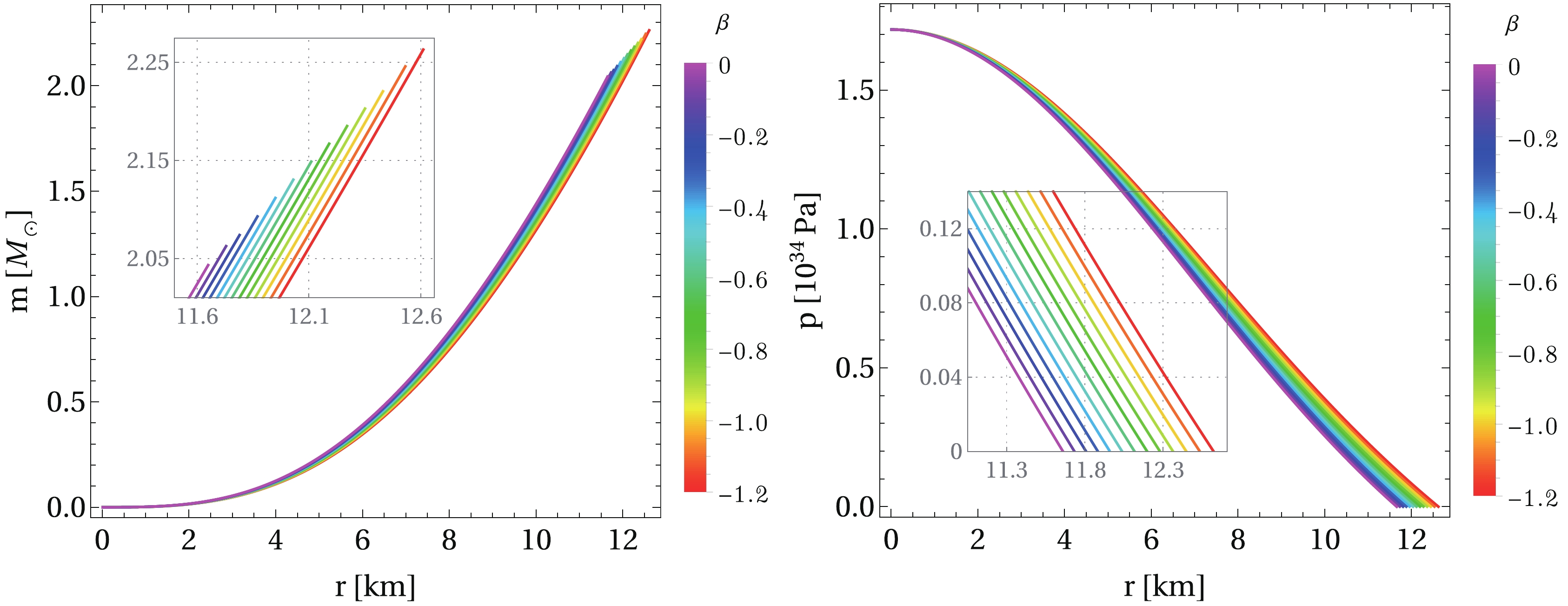$ \rho_c = 1.0 \times 10^{18}\rm kg/m^3 $ , charge parameter$ \alpha = 0.4 $ , and β varying in the range$ \beta \in [-1.2, 0] $ . The radius of the star$ r_{\rm sur} $ is determined when the pressure vanishes, and the total mass M is calculated at the surface. Left panel: mass function, where a smaller value of β results in larger masses and radii. Right panel: pressure as a function of the radial coordinate. Here, we adopt the set of constants$B= 60 ~\rm MeV/fm^3$ ,$ a_4 = 0.7 $ , and$m_s = 100 ~\rm MeV$ .