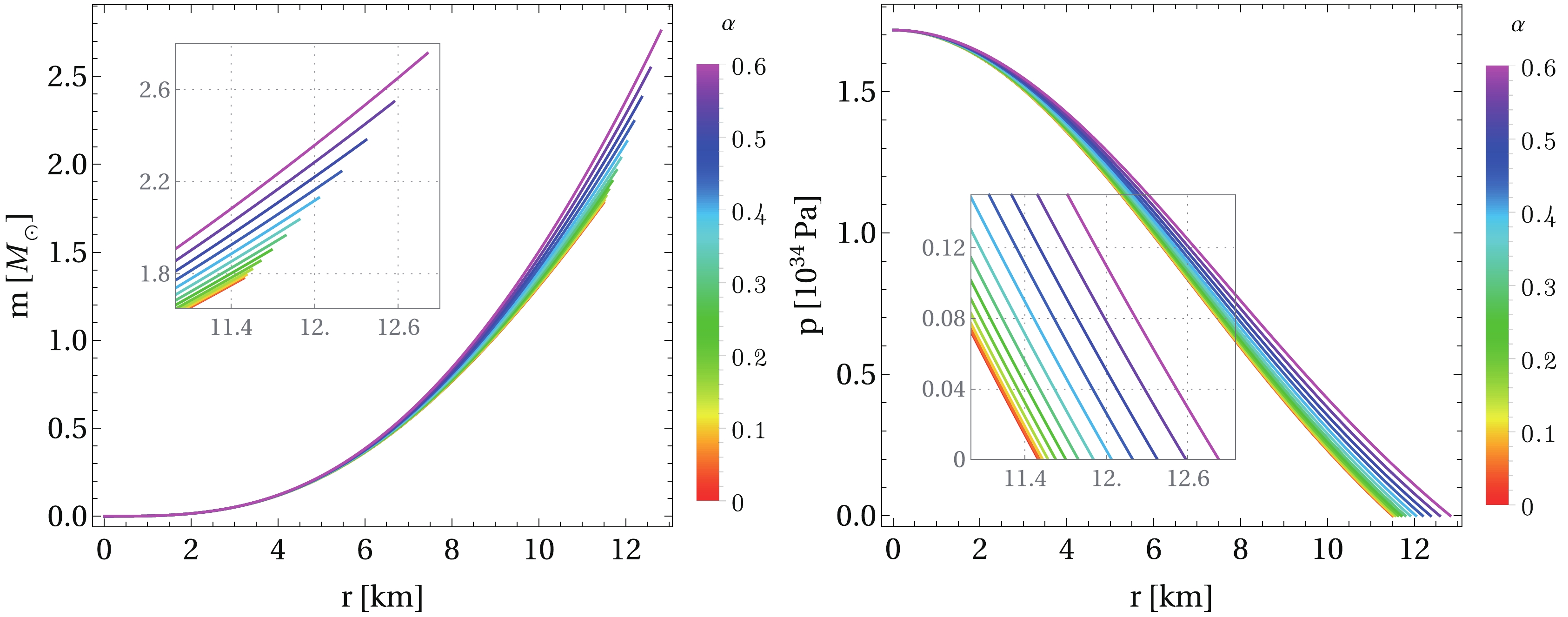 Figure 2. (color online) Radial behavior of the mass function (left panel) and pressure (right panel) for a central energy density