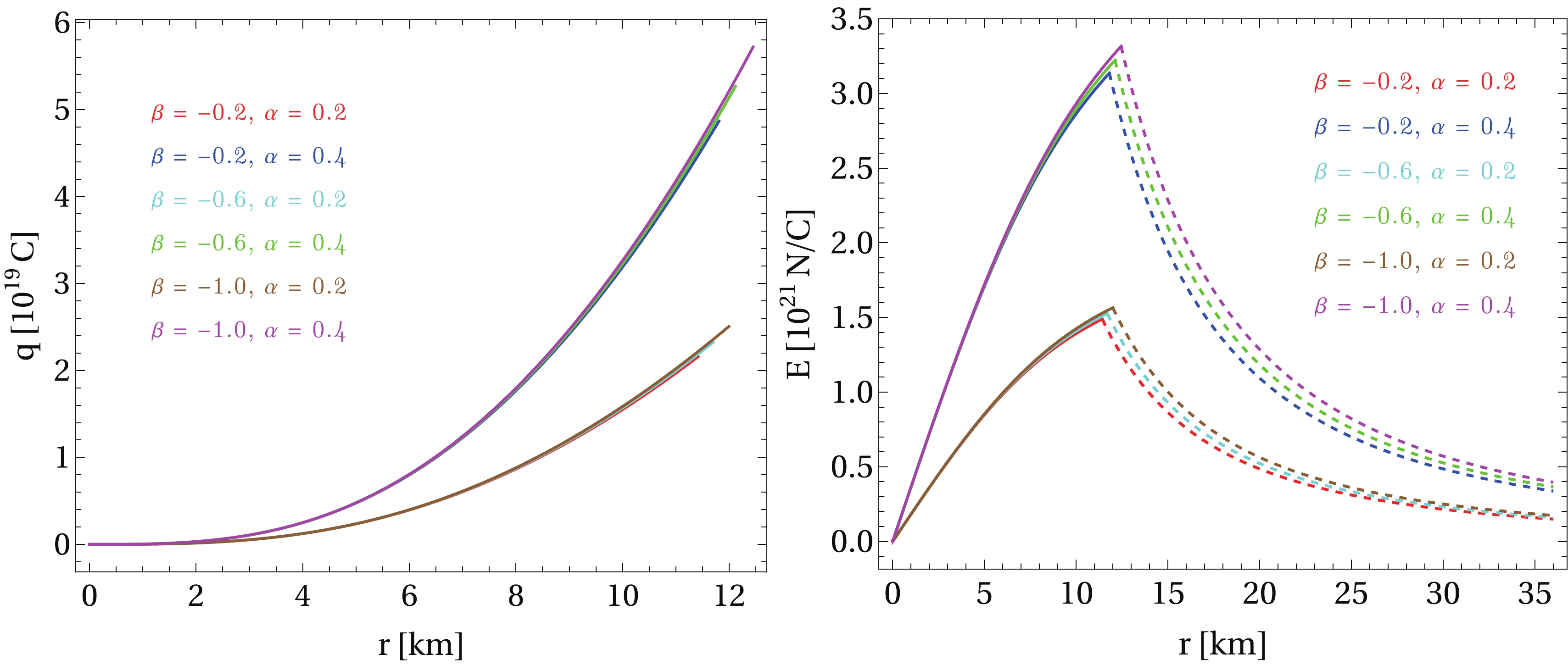 Figure 3. (color online) Radial profile of electric charge (left panel) and electric field (right panel) for the central energy density considered in Fig. 1 and several values of α and β. The dashed curves on the right plot indicate the electric field in the exterior of the star, which goes to zero as we approach infinity. One can observe that the most relevant changes in both electric charge and field are introduced by the parameter α, while such quantities vary slightly when β varies and α is fixed. Note that the main effect of the parameter β is a significant increase in the radius of the star.