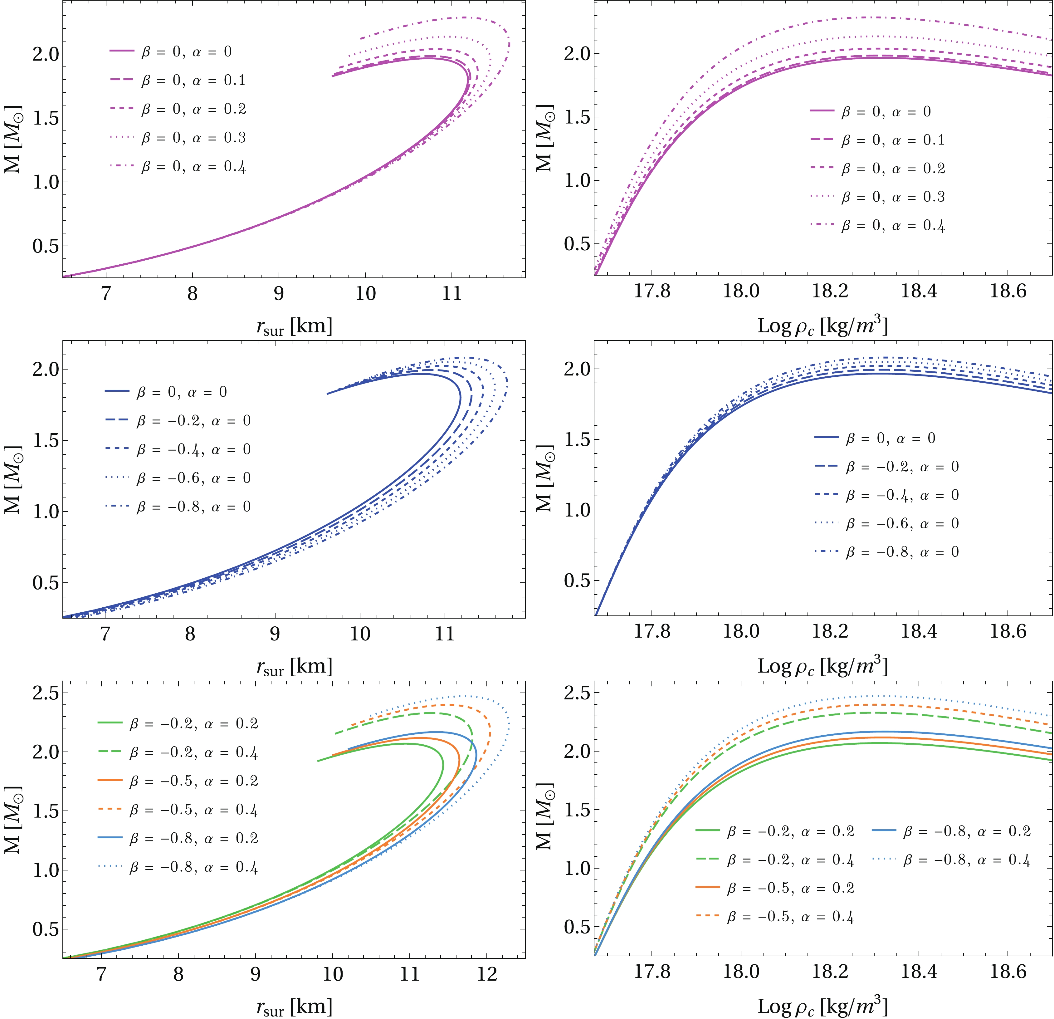 $ \beta= 0 $ ) is shown using magenta curves in the upper panels. The mass and radius undergo substantial changes due to electric charge only in the high-mass region, while the changes are irrelevant for small masses. On the contrary, when$ \alpha=0 $ and the values of β are varied, the intermediate plots exhibit significant deviations from pure GR for uncharged stars. These results have been included for comparison purposes. Nevertheless, the bottom panels show the effect of the electric charge and modification term$ 2\beta T $ on the macro-physical properties of QSs, when both parameters α and β are varied simultaneously. It is visualized that such parameters allow maximum-mass values above$ 2M_\odot $ , and hence, an appropriate combination of these can lead to masses that fit the observational data.