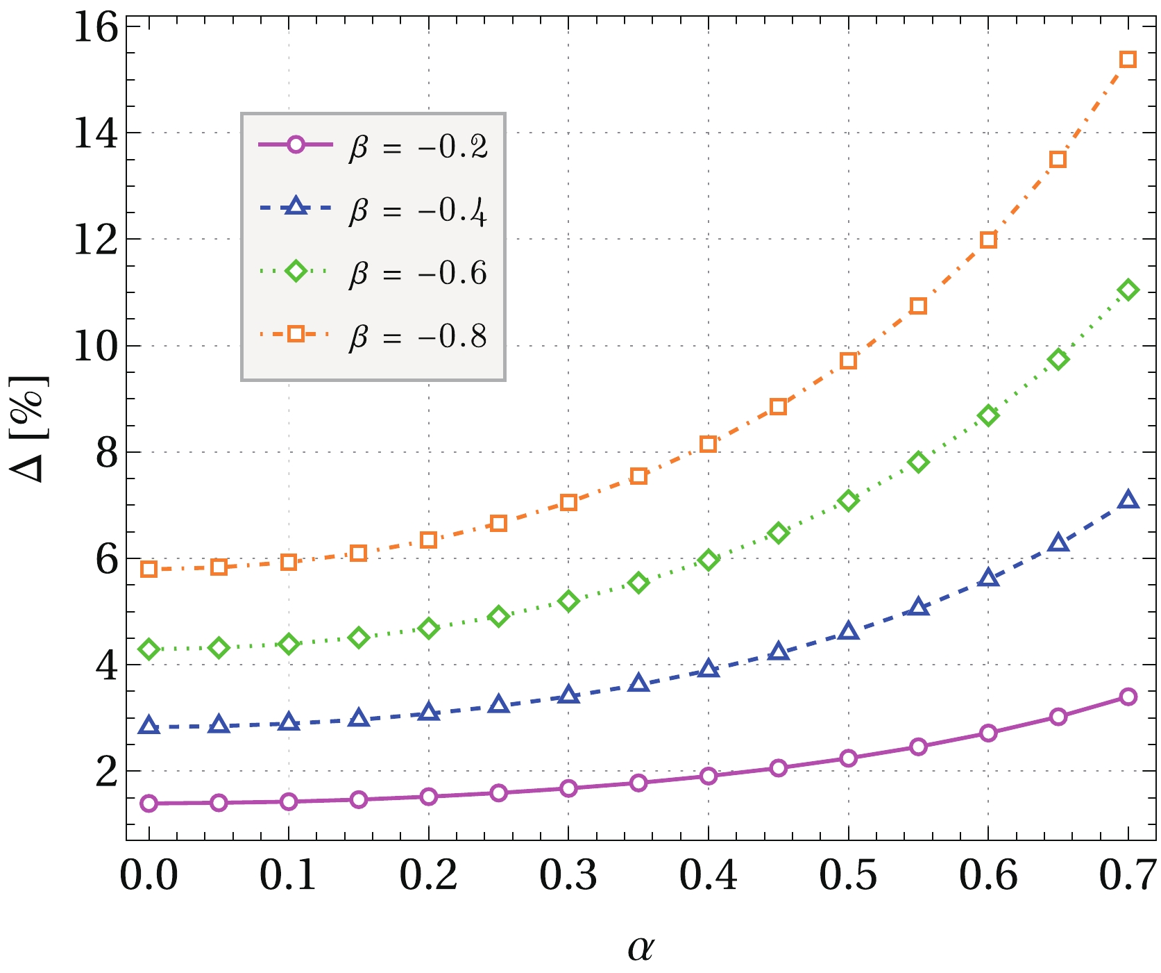 Figure 5. (color online) Relative deviation (34) as a function of the charge parameter for several fixed values of β. The uncharged case corresponds to