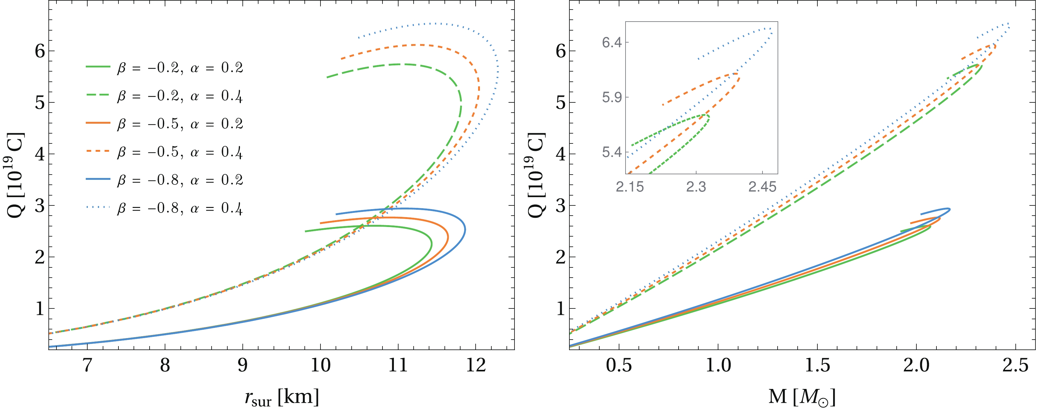 $ 2\beta T $ . Furthermore, the total charge as a function of the gravitational mass is displayed on the right panel of the same figure, where larger masses also yield higher charges, although the details are less apparent when α is fixed.