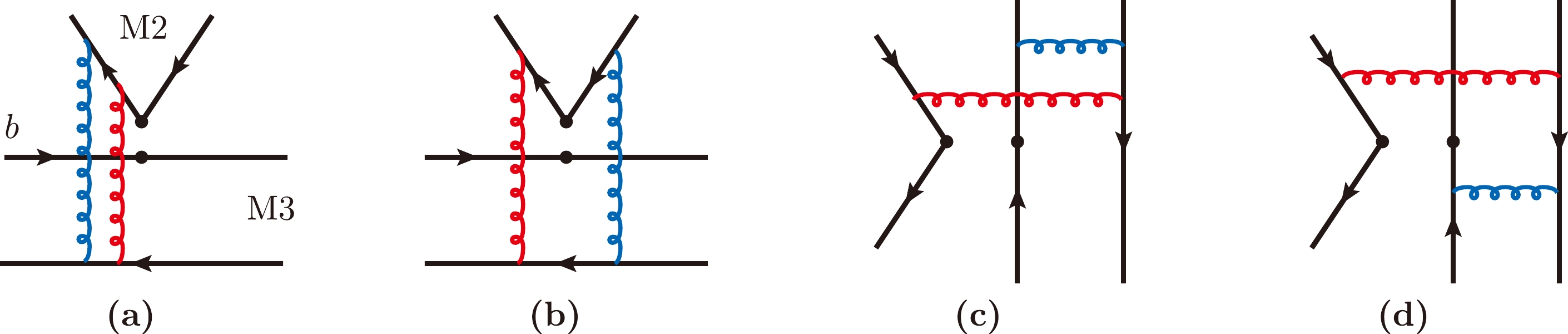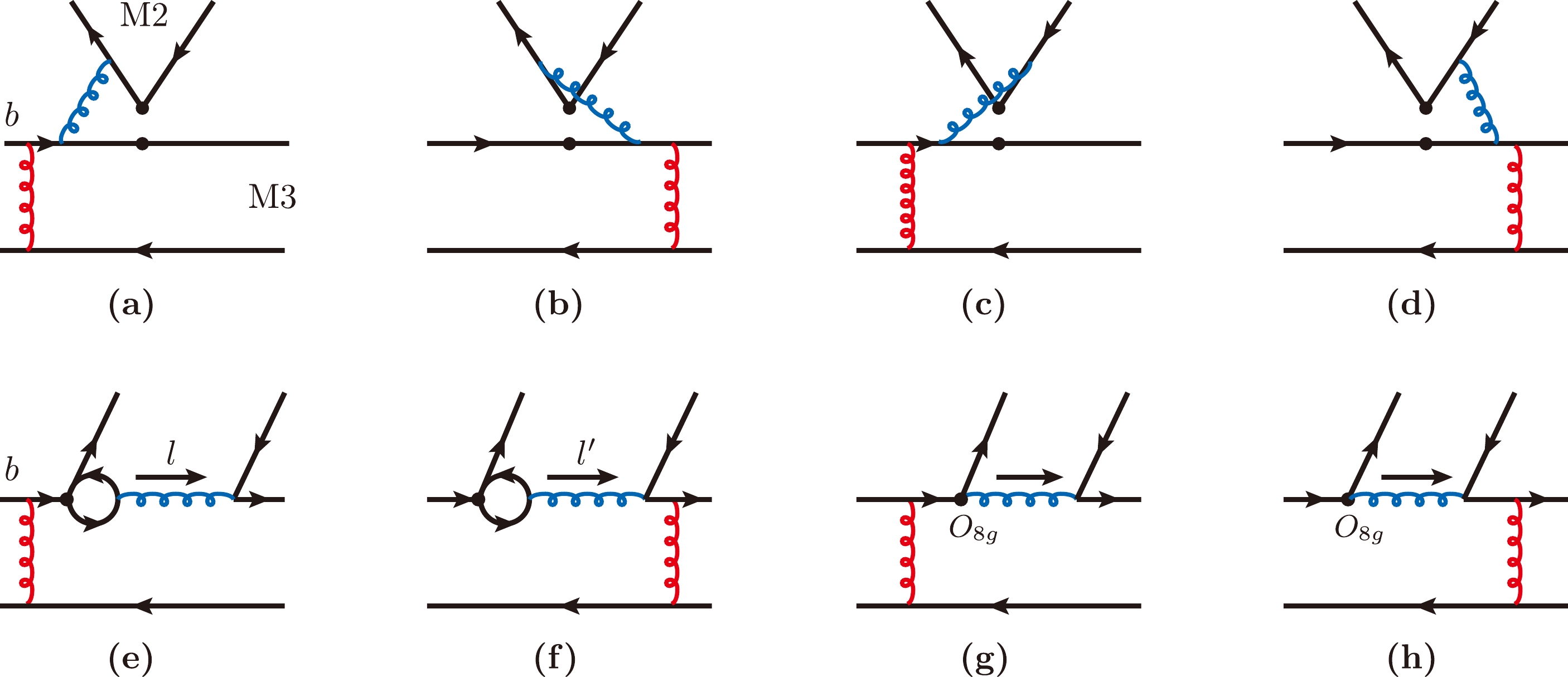 $ x_3p_3 $ ($ \bar x_3p_3=(1-x_3)p_3 $ ). Here,$ x_3 $ is the momentum fraction carried by the quark, as defined in the parton model. All charmless two body B decays are characterized by b quark weak decay through the four quark operators defined in Eqs. (2)–(4). The large b quark mass ensures that all three final state light quarks from the four-quark operator are energetic (collinear); hence, a hard gluon is required to kick the spectator quark, which is soft in the B meson, to make it collinear and therefore form the final light mesons.The hard gluon connects the spectator quark to the four quark operators, producing the four Feynman diagrams for nonleptonic two-body B decays in the framework of the PQCD approach at LO, which is depicted in Fig. 1(a)–(d). Fig. 1(a) and (b) are also the leading Feynman diagrams in the QCDF and SCET framework in numerical calculations. The main difference between these approaches is the treatment of Fig. 1(a) and (b). For example, in the calculation of the second diagram, the gluon propagator along with the quark propagator are proportional to