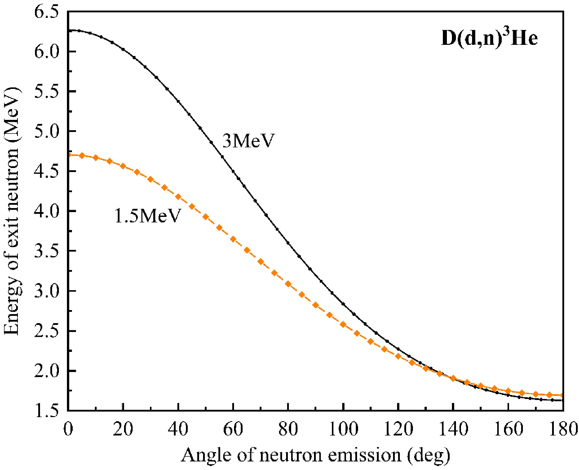 The experiment was performed on a 3 MV tandem accelerator at the Sichuan University. The monoenergetic neutrons were derived from the D (d, n)3He reaction, whereby the D-beam stream generated by the 3 MV tandem accelerator was used to bombard the solid titanium deuteride (D-Ti) target. Mo was used as the substrate and was covered with a Ti film to adsorb D nuclei. The D-beam energies of this experiment were 1.5 MeV and 3 MeV, and the beam intensities were 13 μA and 22 μA, respectively. The neutron energy changes with the neutron emission angle. The distribution of the neutron energy with respect to the angle of the D-beams with energies of 1.5 MeV and 3 MeV incident on the D target is as shown in Fig. 1. The mass thickness of the D-Ti target was 2.01 mg/cm 2, and the D to Ti atomic adsorption ratio was 1.77. A circulating cooled water stream was utilized to neutralize the heat generated on the Mo substrate during the nuclear reaction to avoid localized overheating of the target.