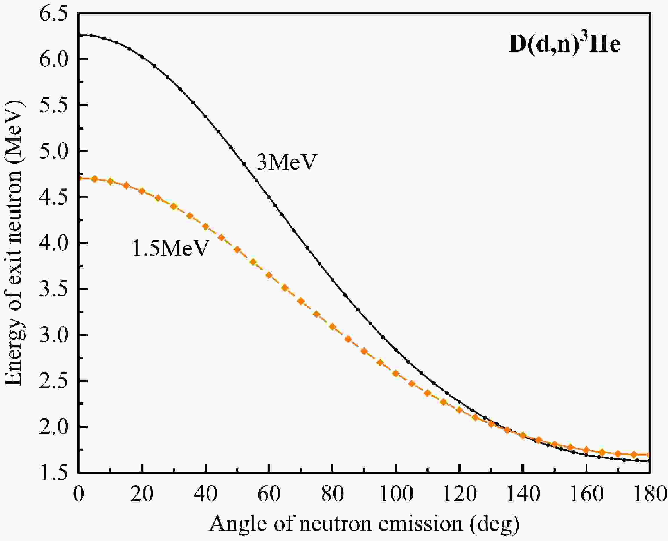 $ {\stackrel{-}{E}}_{n} $ at a particular angle is calculated from the average D-beam energy$ {\stackrel{-}{E}}_{d} $ incident on the D-Ti target with a specific thickness according to nuclear reaction kinetics under non-relativistic conditions. Taking into account the effect of the finite geometrical tensor angle on the neutron energy distribution at the sample, the average neutron energy$ {\stackrel{-}{E}}_{n} $ in the 0° direction is calculated by the following equations:$ {\bar E_n} = \frac{{2{d^2}}}{{{R^2}}}\int_0^\theta {{E_n}} (\theta ,{\bar E_d})\frac{{\tan \theta }}{{{{\cos }^2}\theta }}{\rm d}\theta , $