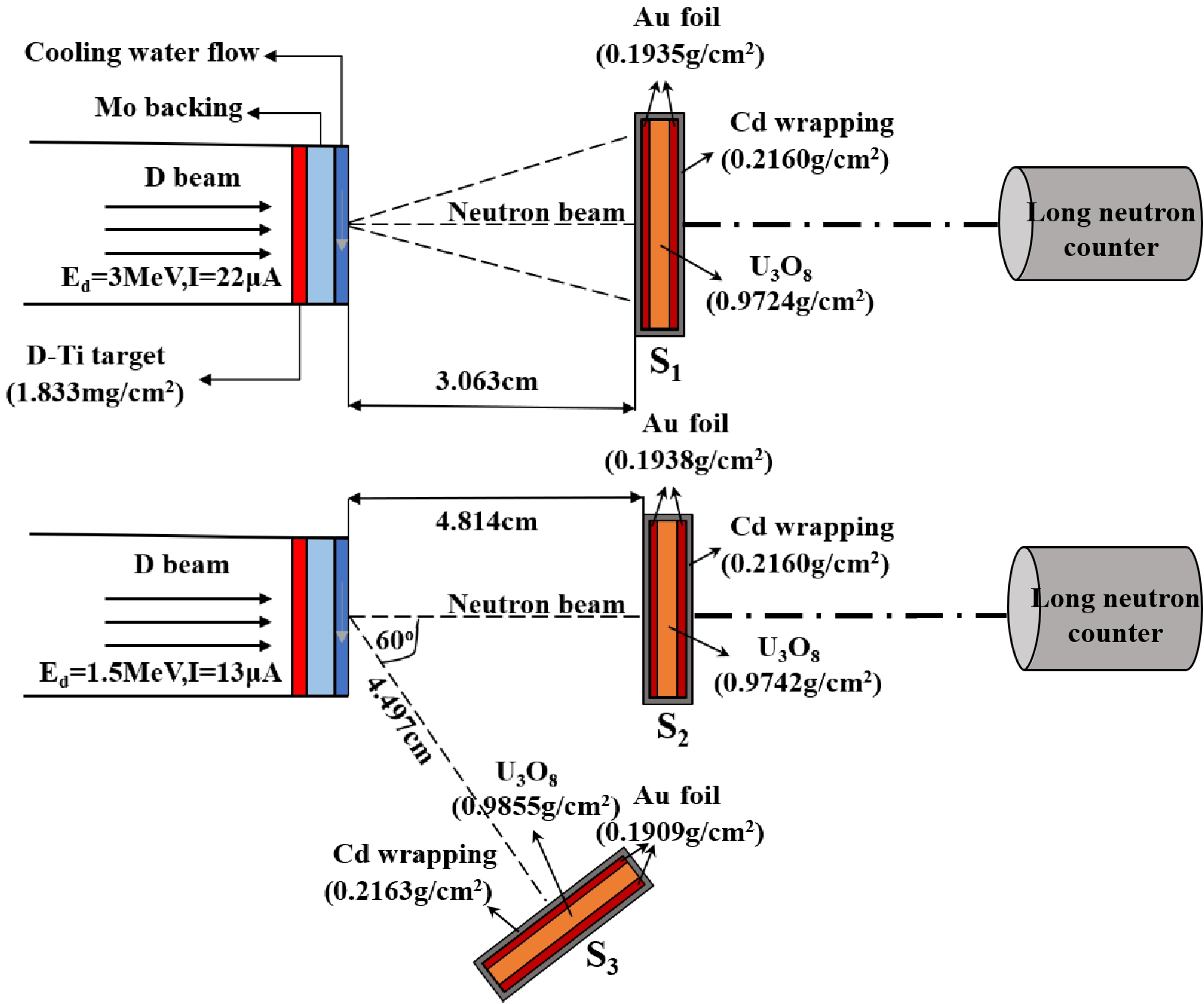 In this experiment, U3O8 black powder with a purity of more than 99.9% was kept in an oven (temperature 60 °C) for 12 h to remove moisture. It was removed and then pressed into three disk-shaped samples with a diameter of 20 mm. The mass thicknesses of the samples were 0.9724 g/cm2, 0.9742 g/cm2, and 0.9855 g/cm2 (numbered as S1, S2, and S3, respectively). The U3O8 samples were sandwiched between two Au flakes and covered with a 0.3 mm thick Cd case outside. Au flakes with the same diameter as the samples and a thickness of approximately 0.1 mm were availed to identify the flux of the neutrons at the sample using the 197Au (n, γ)198Au reaction. The influence of slow thermal neutrons was eliminated by utilizing a Cd case with a large thermal neutron capture cross-section.