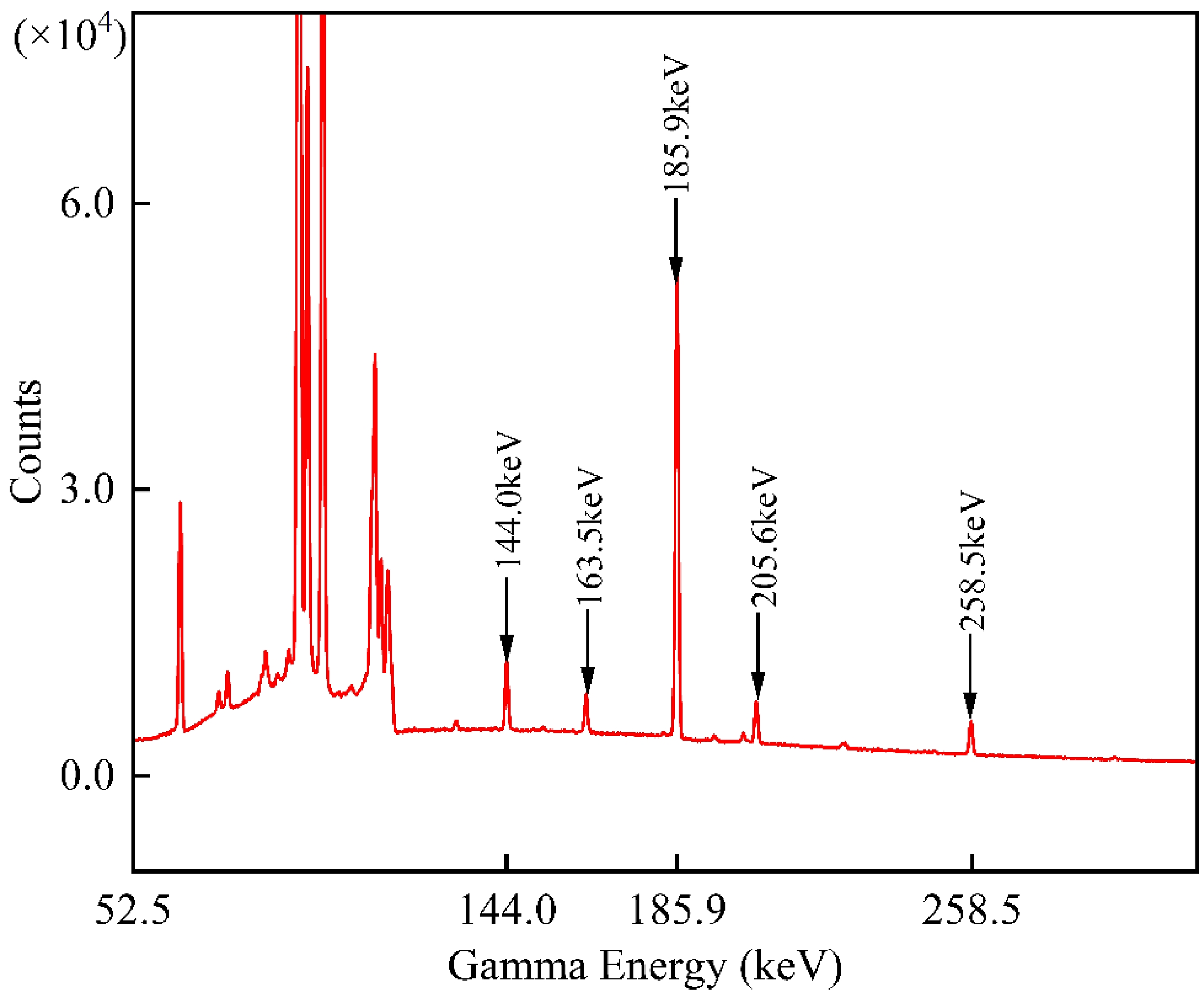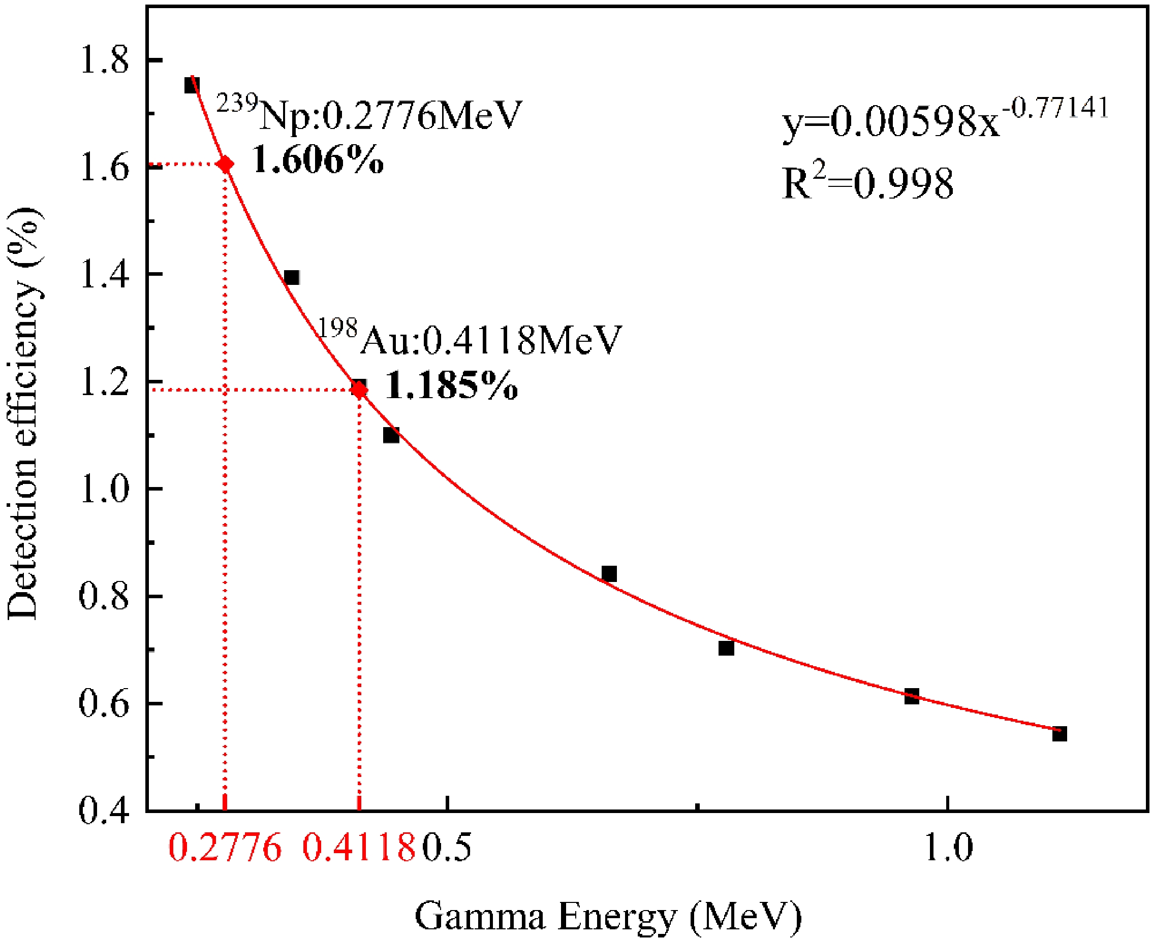 After the samples had been irradiated for 12 h and cooled for an adequate amount of time (2.7–43 h for Au flakes and 3.5–48 h for U3O8 samples), the characteristic γ-rays produced were measured with a single-ended coaxial low-background GEM30P4-76 HPGe detector with an energy resolution of 850 eV FWHM at 122 keV and 1.85 keV FWHM at 1.33 MeV [6, 30] as well as a 30% relative efficiency. The working high voltage was +2 kV, which was provided by ORTEC's 659 high-voltage power supply; the main amplifier 672 (pulse linear amplifier) had an adjustment multiple of 65 times and a time constant of 6 μs. Calibration of the detector efficiency used the standard source calibrating method, using the 152Eu and 137Cs standard sources with known activities to obtain the source peak detection efficiency. The distance transformation method was used to eliminate the cascade coincidence effect produced by the 152Eu multiple γ-ray source, so as to receive the efficiency fitting curve of the HPGe detector at a distance of 5 cm from the probe, thereby obtaining the full-energy peak detection efficiencies for the required characteristic γ-rays, as shown inFig. 3. A representative γ-ray spectrum for the irradiated U3O8 sample is presented in Fig. 4, in which the relevant γ-rays have already been labeled. For comparison, part of the gamma spectrum of the U3O8 sample without neutron irradiation is showed in Fig. 5.