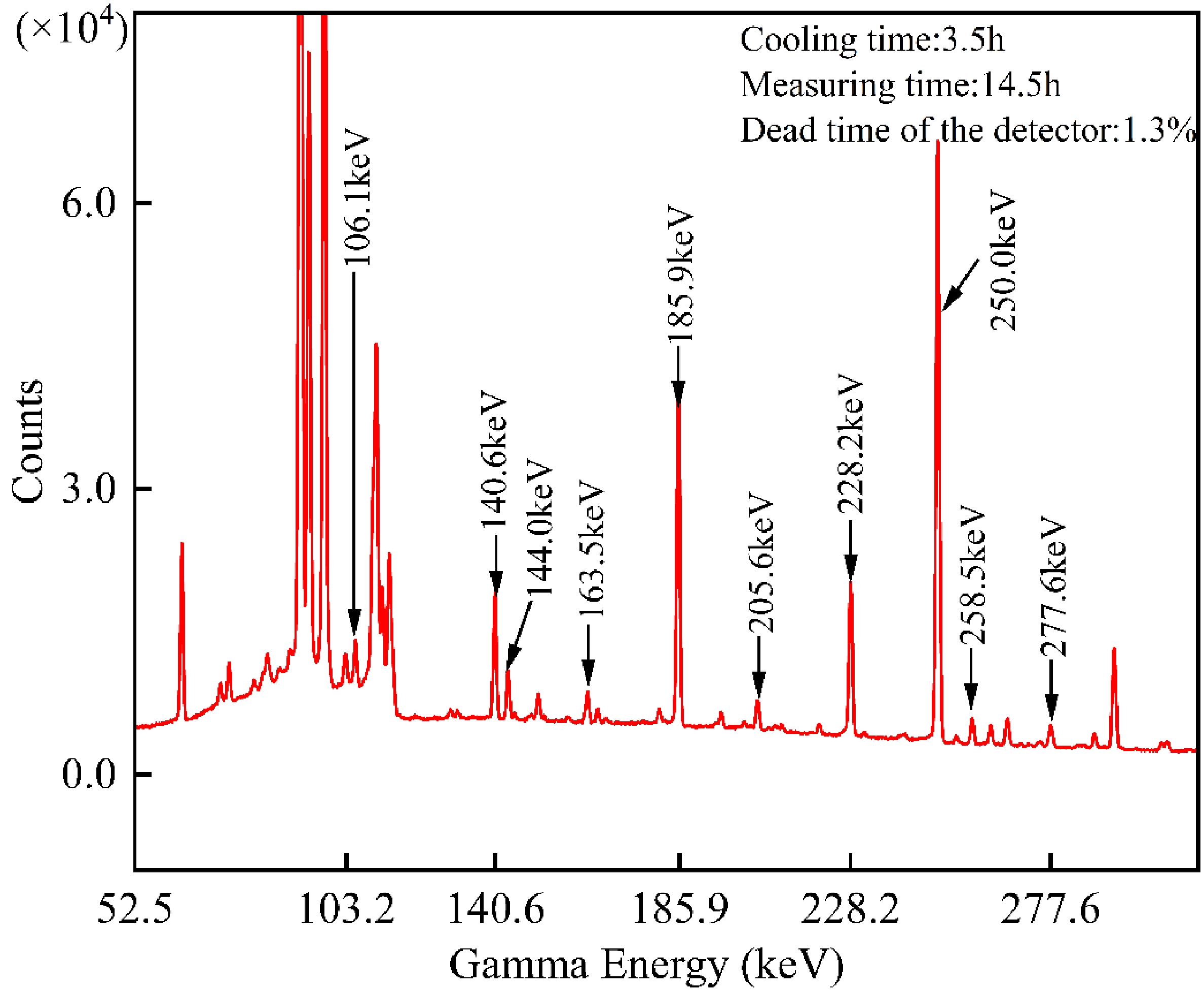 The decay parameters of the generated radionuclides 239U and 239Np are all from NuDat3.0 [31] and are listed in Table 1. It can be found that the radioisotope 239U has a relatively short half-life of only 23.45 min, and that the characteristic γ-ray intensity greater than 50% has an energy of only 74.66 keV. The characteristic γ-rays with 74.66 keV produced by 239U are of low energy, and the measurement of the full-energy peak by this characteristic γ-ray with the HPGe detector has a large uncertainty. In addition, owing to the γ-ray self-absorption effect of the sample, it is hardly possible to accurately determine the amount of 239U by net counts of the full-energy peak of the characteristic γ-rays generated by 239U. Therefore, the characteristic γ-rays with 277.6 keV originating from the primary