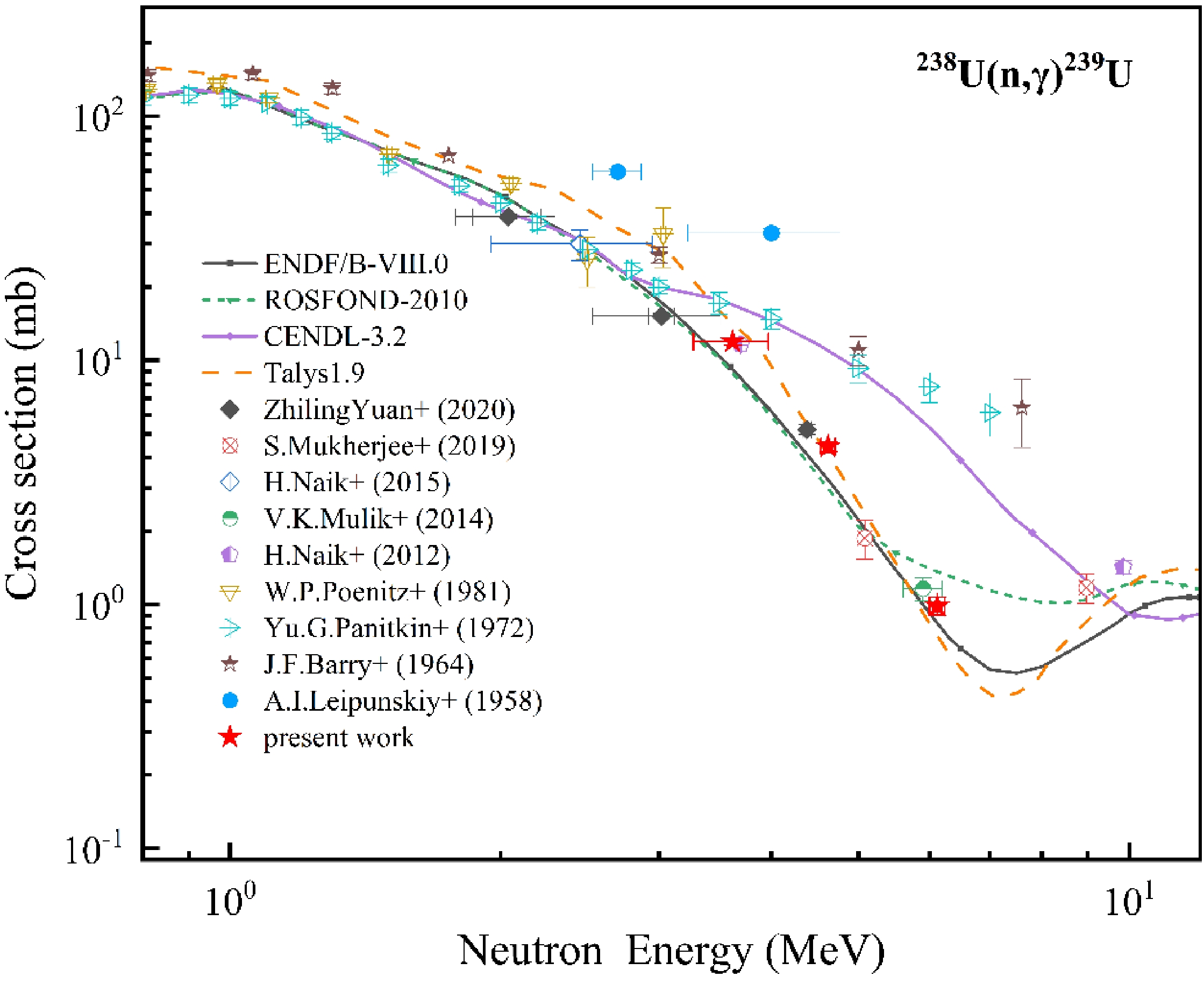 for certain Generation IV nuclear reactors [1] and accelerator-driven subcritical systems (ADSs) [2]. The capturing of neutrons by the substantial amount of 238U in the fuels will have a certain impact on the secure performance of these reactors. Moreover, fast breeder reactors (FBRs) are based on the 238U-239Pu fuel cycle, in which the fertile isotope 238U is used as the breeder material to regenerate the fissile nuclide 239Pu. The radionuclide 239Pu is produced by the 238U (n, γ) reaction and two consecutive beta decays of 239U [3, 4]. The yield of 239Pu relies on the 238U (n, γ)239U reaction cross-section, resulting in the requirement to determine the precise reaction cross-sectional values of 238U (n, γ)239U to anticipate the dynamical behaviors of complicated arrangements and security [4, 5]. Meanwhile, the value of the conversion ratio, the ratio of the amount of nuclear fuel produced by the fast reactor operation to the consumption, depends on the 238U neutron capture cross-section. It can reach the necessary value to realize the self-sustainment of nuclear fuel in FBRs. Consequently, the reaction cross-section of 238U (n, γ)239U is an incredibly valuable nuclear physics parameter for the implementation of a system on the basis of the 238U-239Pu fuel cycle and is intimately involved in fuel multiplication. Physical-based measurements for the 238U (n, γ)239U reaction cross-sections in the incident neutron energy region of 0.025–20 MeV [4–25] have been sufficiently well documented by several investigators. The majority of these experimental values are centralized in the region of the neutron energy provided by the reactors, electrostatic accelerators, and high-voltage multipliers. Nevertheless, the cross-section measurements were performed at only eight energy points within the 3.0–7.0 MeV [4, 6, 7, 18] energy region, and the measurement values are still relatively inaccurate and vary widely for the same energy point. Moreover, it is apparent that there are substantial variations among the evaluation databases for this energy region with three distinct tendencies; in particular, the ENDF/B-VIII.0 [26] and CENDL-3.2 [27] databases reach a maximum difference of 81.2% at a neutron energy of 7 MeV. The experimental values obtained by Panitkin et al. [24] are compatible with the evaluation database CENDL-3.2 but are superior to the ENDF/B-VIII.0 and ROSFOND-2010 [28] databases in the 3.0–7.0 MeV energy region. In contrast, the experimental measurements of Mulik et al. [4] at 5.9 ± 0.5 MeV neutron energy and the data of S.Mukherjee et al. [7] at 5.1 ± 0.2 MeV are in general accordance with the evaluation databases ENDF/B-VIII.0 and ROSFOND-2010, respectively, yet far inferior to the evaluation data of CENDL-3.2. As stated above, accurate measurements of the reaction cross-sectional values of 238U (n, γ)239U in the 3.0–7.0 MeV neutron energy region are critical for the assessment of cross-section data.