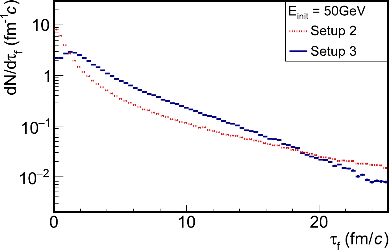 In Fig. 1, we show the formation time distribution of the final-state Pythia partons developed from a single quark at a fixed energy of 50 GeV and maximum possible virtuality scale of 50 GeV; besides, setup-2 (single splitting) and setup-3 (sequential splittings) are compared. One would expect a δ-function at zero formation time for setup-1 (instantaneous formation). Compared to setup-1, one observes that a large number of partons from setup-2 and 3 are formed during the QGP phase: there are only approximately 50% partons for setup-2 and 20% partons for setup-3 formed before
