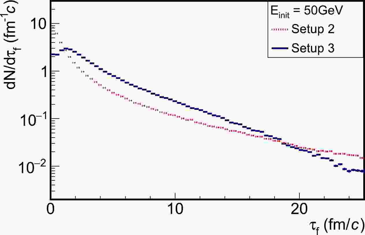 $ \tau_2=2Ex(1-x)/k_\perp^2 $ , where E represents the energy of the ancestor parton (directly produced by the initial hard scattering) at the top of the mother-daughter tree generated by Pythia shower, and x and$ k_\perp $ are respectively the fractional energy and transverse momentum of the given final-state parton with respect to its ancestor; thus, this jet parton starts to interact with QGP at$ t_\mathrm{init}=\max (\tau_0,\tau_2) $ .● Setup 3: formation time from multiple splittings – the full sequence of splittings from the very first ancestor to each final-state parton in Pythia is tracked, and the parton formation time is calculated as