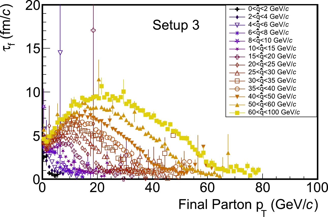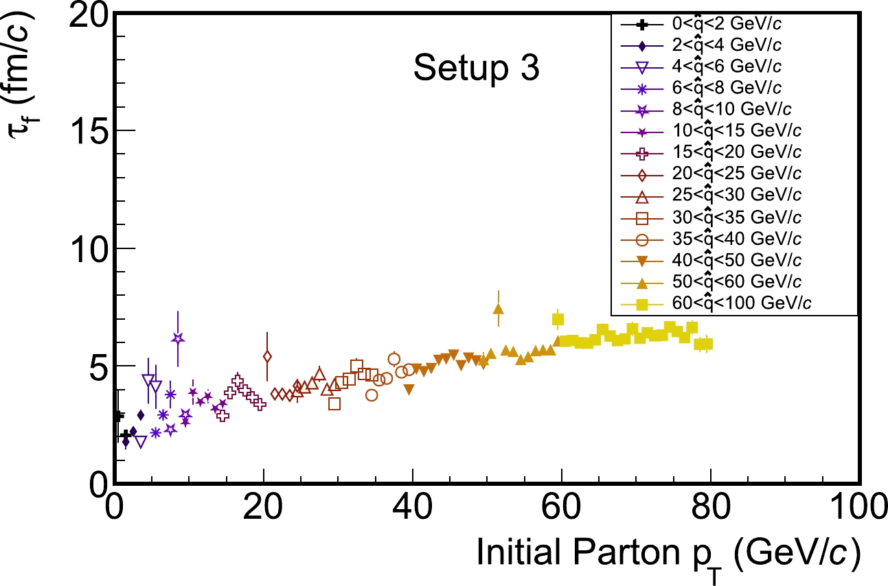 $ \tau_1=0 $ ) and jet partons start to interact with QGP when the hydrodynamic evolution of QGP commences (at$ \tau_0 $ ).● Setup 2: formation time from single splitting – each parton is assumed to be formed from one splitting, which requires a time expressed as