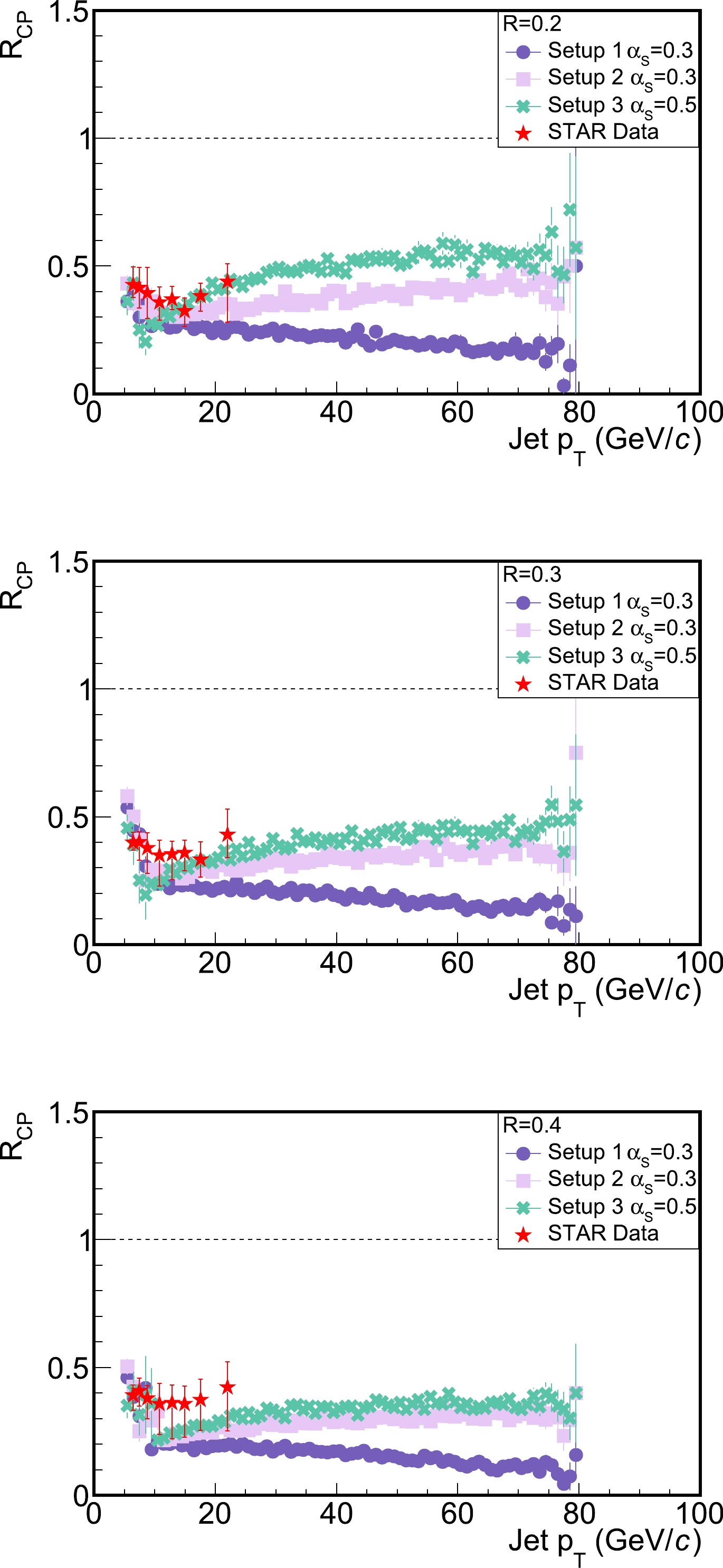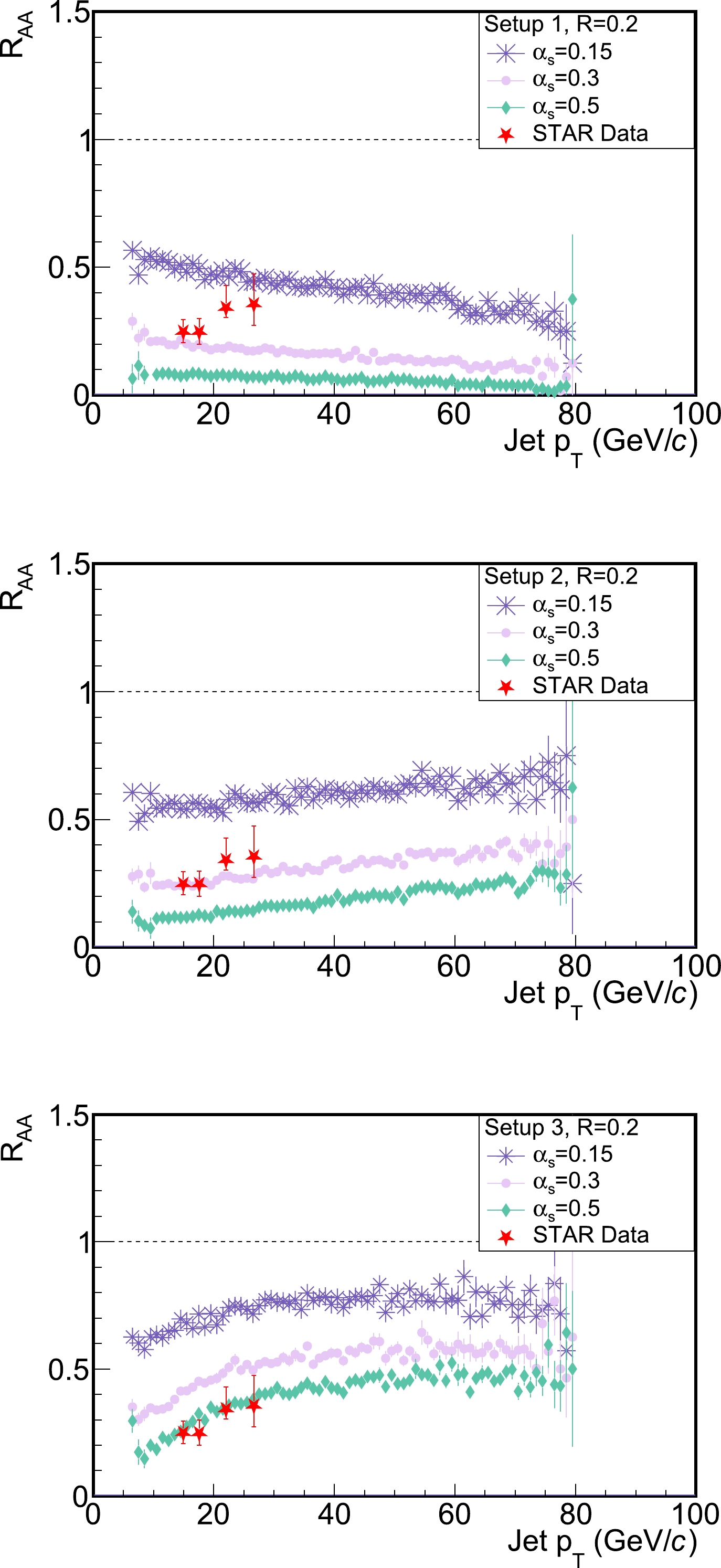 $ R_{AA} $ of jets in 0–10% Au+Au collisions at$\sqrt{s_{NN}}=200$ GeV; different$ \alpha_\mathrm{s} $ values and setups of the parton formation time are employed for comparison – upper panel for setup-1, middle panel for setup-2, and lower panel for setup-3.To avoid uncertainties introduced by lacking the p+p baseline of jet measurement, one may also quantify the nuclear modification effect using the central-to-peripheral ratio (