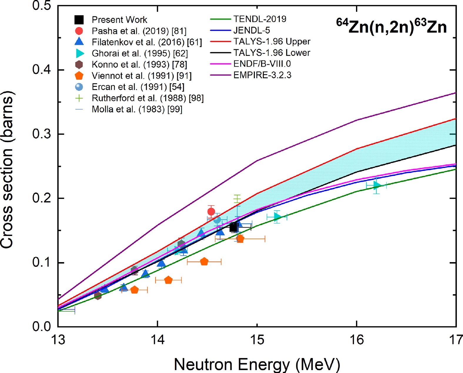 Figure 11 shows the measured cross section of the 64Zn(n,2n)63Zn reaction at a neutron energy of 14.77 ± 0.17 MeV along with the experimental data from the EXFOR database; evaluated data from the TENDL-2019, JENDL-5, and ENDF/B-VIII.0 libraries; and the TALYS-1.96 uncertainty calculations. The experimental data of Refs. [54, 61, 62, 78, 81, 91, 98, 99] were normalized with the IRDFF-II evaluations for their respective monitor data. The reported cross section data of Refs. [78, 91] were normalized for the gamma-yield per decay of the 669.62 KeV γ-line of 63Zn, and the change was 3%.
