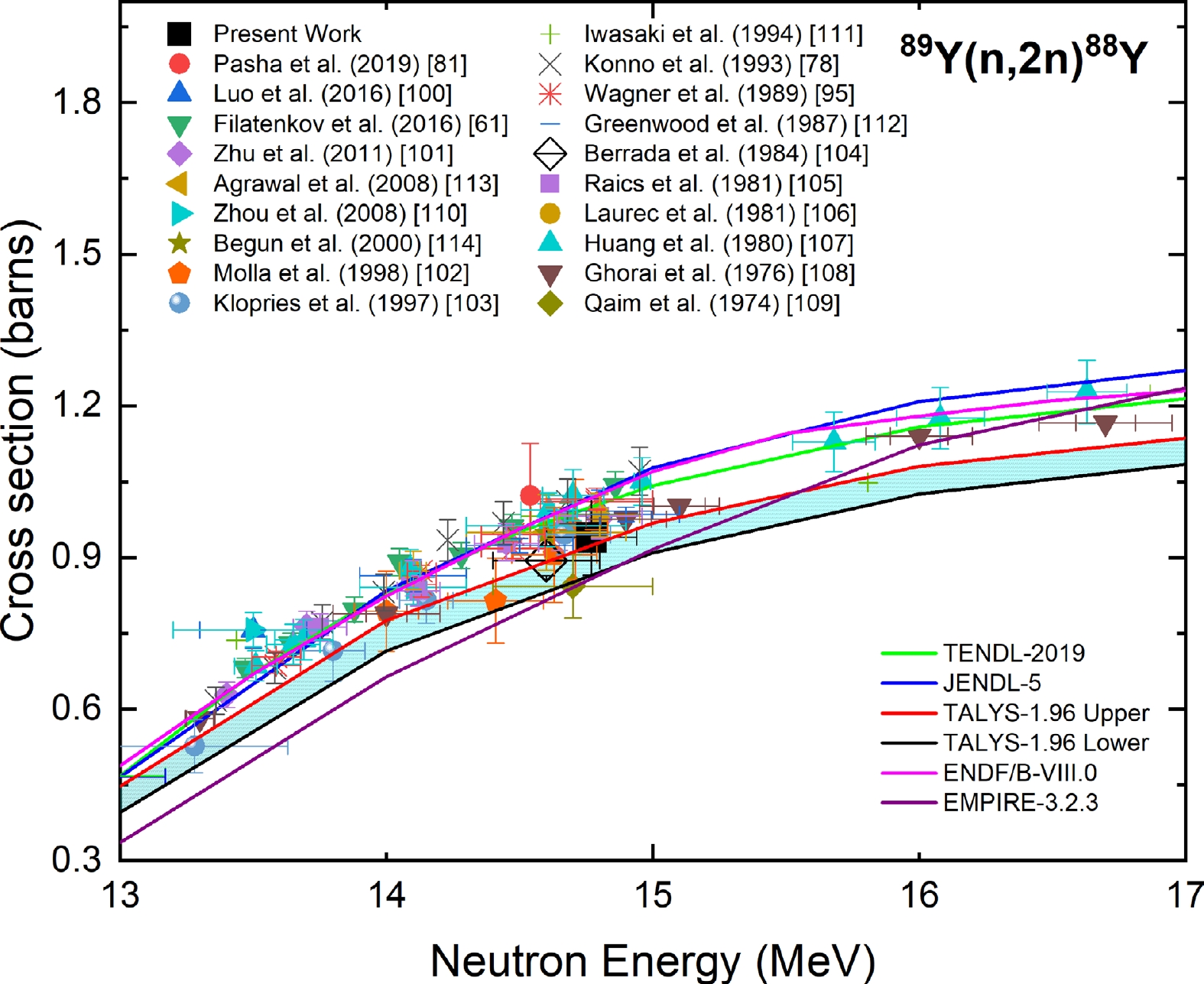 Figure 13 shows the measured cross section for the 89Y(n, γ)90Ym reaction at a neutron energy of 14.77 ± 0.17 MeV in comparison with the experimental data from the EXFOR database; evaluated data from the TENDL-2019, JENDL-5, and ENDF/B-VIII.0 libraries; and the TALYS-1.96 uncertainty calculations. The reported data of Ref. [81] after normalization with the IRDFF-II evaluation of the 197Au(n, 2n)196Au monitor reaction decreased by 2%. The reported data of Ref. [110] after normalization with the IRDFF-II evaluation of the 93Nb(n, 2n)92Nbm monitor reaction changed by less than 1%. The data reported by Refs. [74, 115–117] were normalized with the IRDFF-II evaluation of the 27Al(n, α)24Na monitor reaction at their respective neutron energies. The data of Refs. [74, 115–117] upon normalization changed by less than 2% from the reported value.