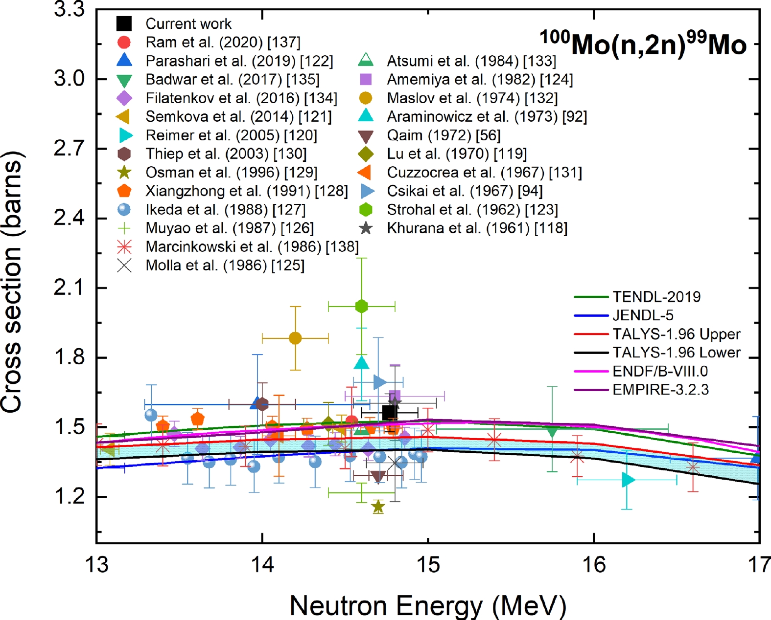 Figure 14. (color online) Measured experimental cross section for the 100Mo(n, 2n)99Mo reaction compared with EXFOR data, TALYS-1.96 calculations, and evaluated nuclear data.