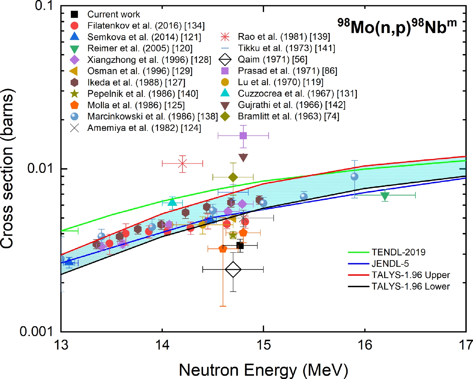 Figure 15. (color online) Measured experimental cross section for the 98Mo(n, p)98Nbm reaction compared with EXFOR data, TALYS-1.96 calculations, and evaluated nuclear data.