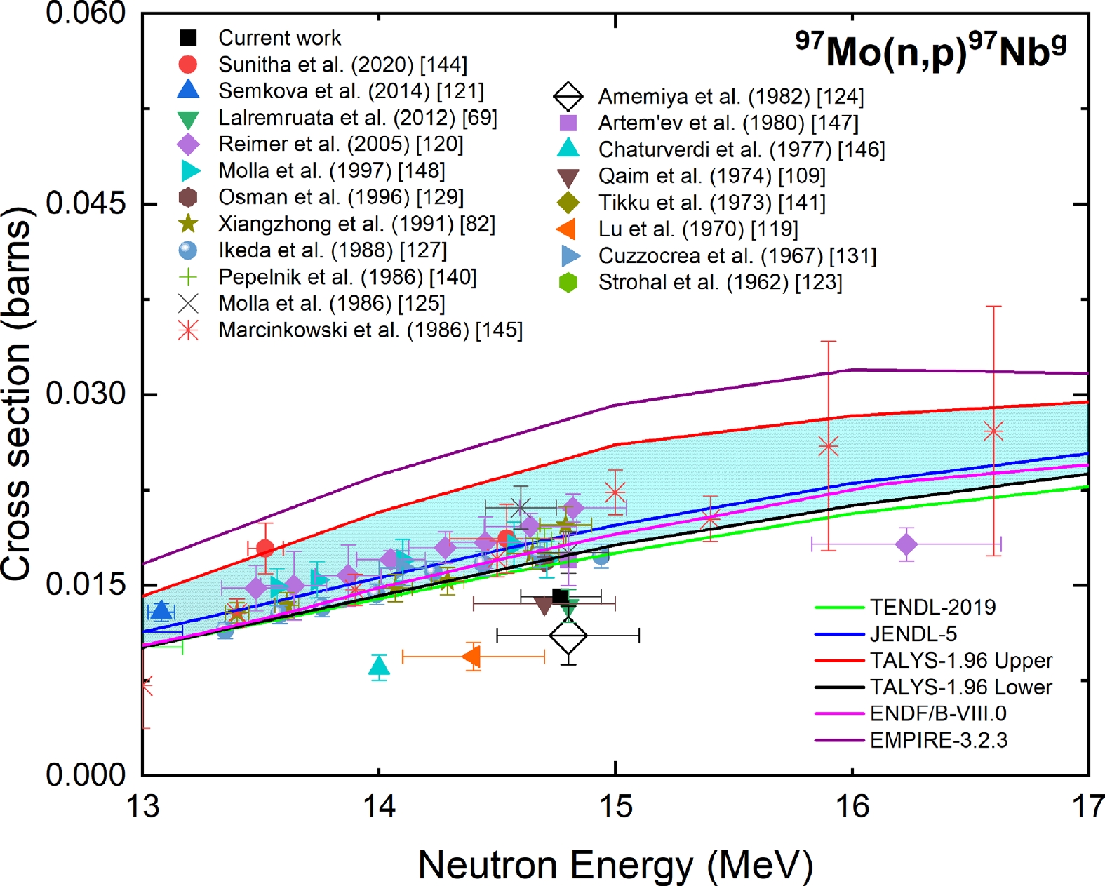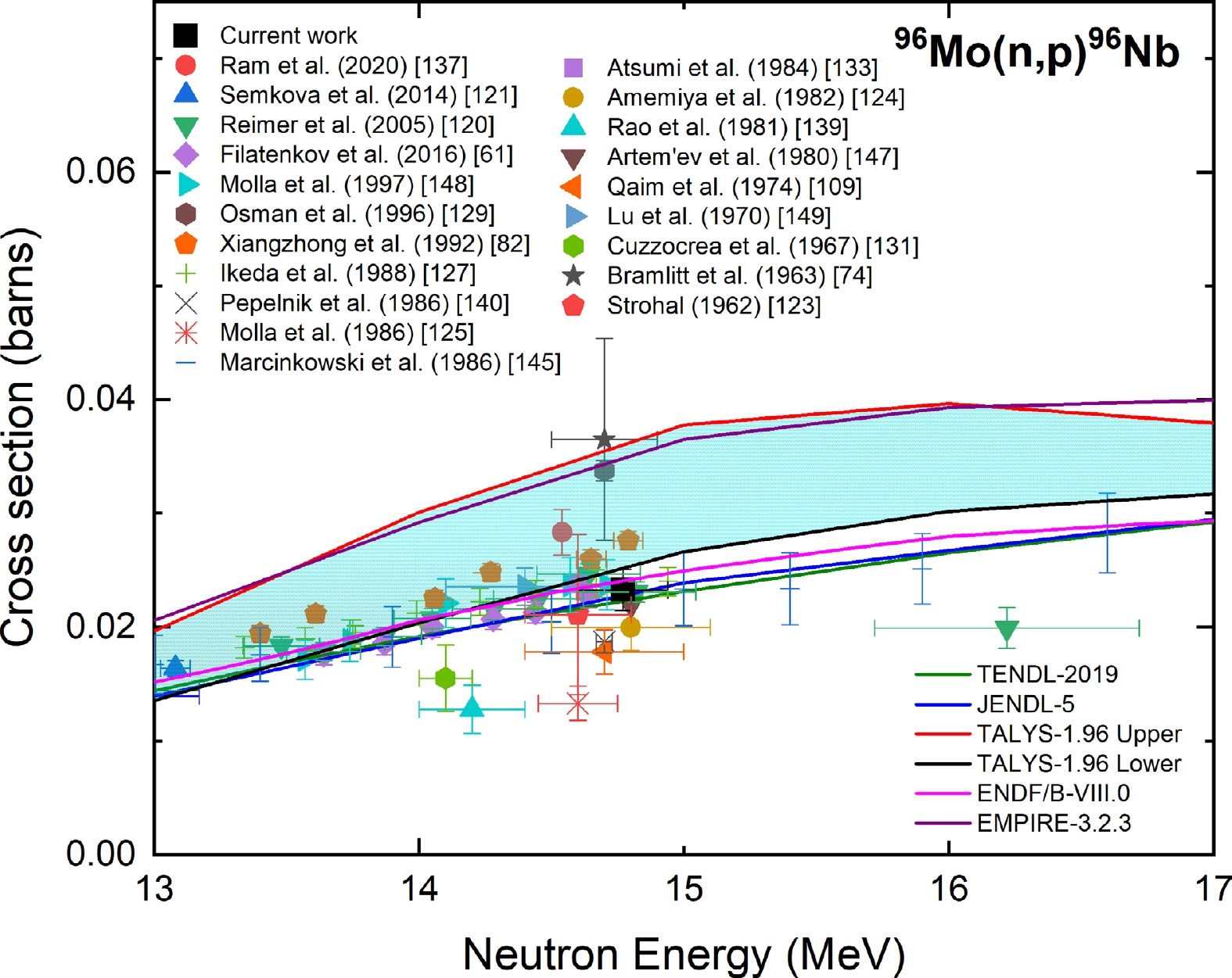 Figure 17. (color online) Measured experimental cross section for the 96Mo(n, p)96Nb reaction compared with EXFOR data, TALYS-1.96 calculations, and evaluated nuclear data.