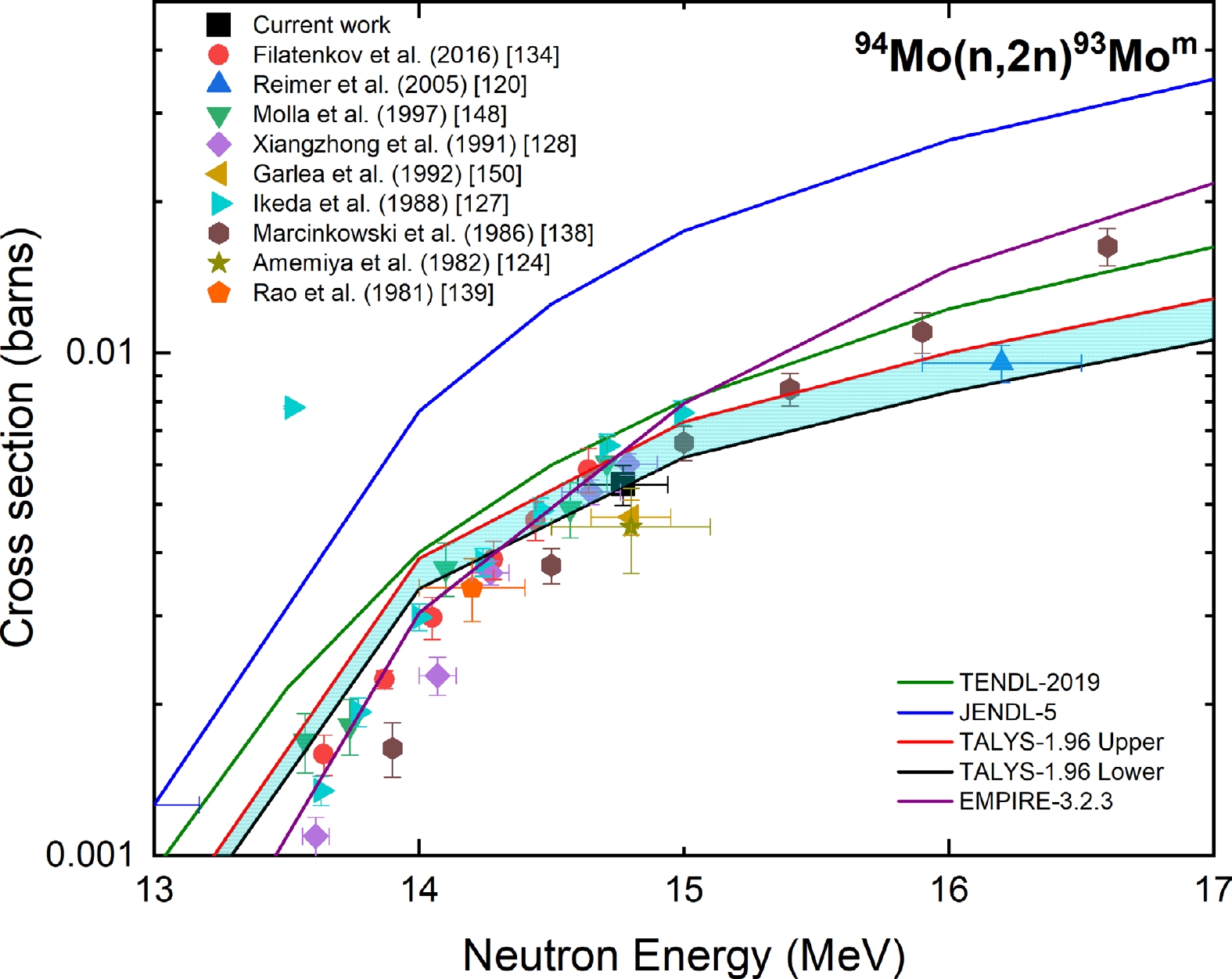 Figure 18. (color online) Measured experimental cross section for the 94Mo(n, 2n)93Mom reaction compared with EXFOR data, TALYS-1.96 calculations, and evaluated nuclear data.