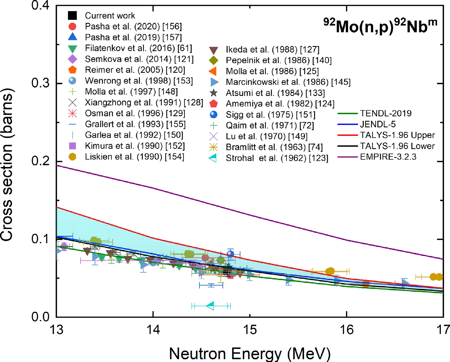 Figure 19. (color online) Measured experimental cross section for the 92Mo(n, p)92Nbm reaction compared with EXFOR data, TALYS-1.96 calculations, and evaluated nuclear data.