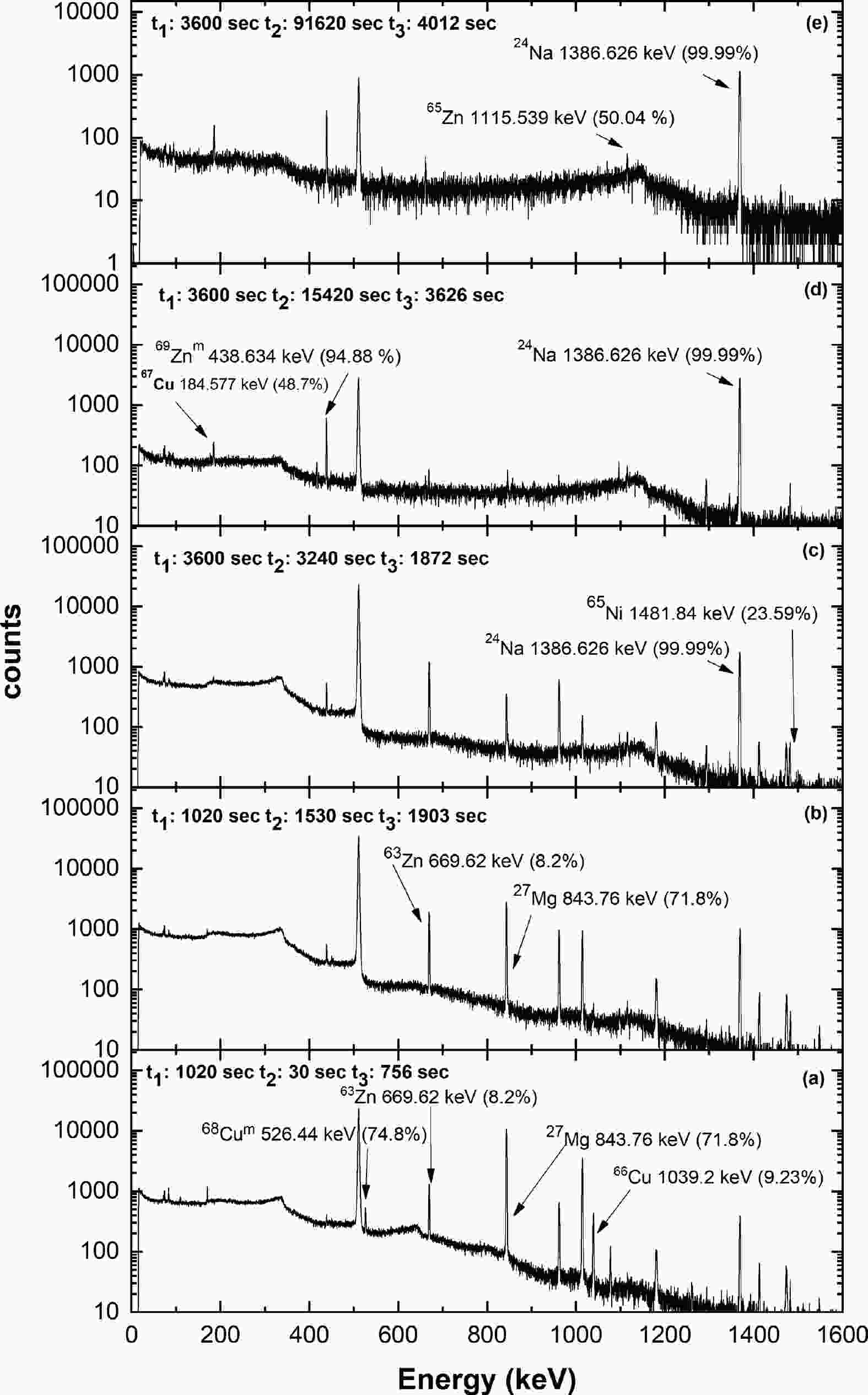 $ {t}_{1} $ is the irradiation time,$ {t}_{2} $ is the cooling time, and$ {t}_{3} $ is the counting time. In Fig. 1 (a) and (b), the short half-life gamma-ray spectra are shown for product nuclides 68Cum, 66Cu, and 63Zn along with the monitor reaction product nuclide 27Mg. In Fig. 1 (c), (d), and (e), the long half-life gamma-ray spectra are shown for product nuclides 65Ni, 67Cu, 69Znm, and 65Zn along with the monitor reaction product nuclide 24Na. In Fig. 2, the gamma-ray spectrum is shown for product nuclides 90Ym and 88Y along with the monitor reaction product nuclide 24Na. In Fig. 3 (a), the short half-life gamma-ray spectrum is shown for product nuclides 89Zrm and 98Nbm along with the monitor reaction product nuclide 27Mg. In Fig. 3 (b) and (c), the long half-life gamma-ray spectra are shown for product nuclides 97Nbg, 99Mo, 93Mom, 96Nb, 89Zrg, and 92Nbm along with the monitor reaction product nuclide 24Na. The nuclear data adopted for the calculation of cross sections are given in Table 2 along with the respective references. The details of the threshold energy, cooling time, counting time, and gamma-ray net peak counts are listed in Table 3.Nuclide T1/2 Decay mode Eγ
