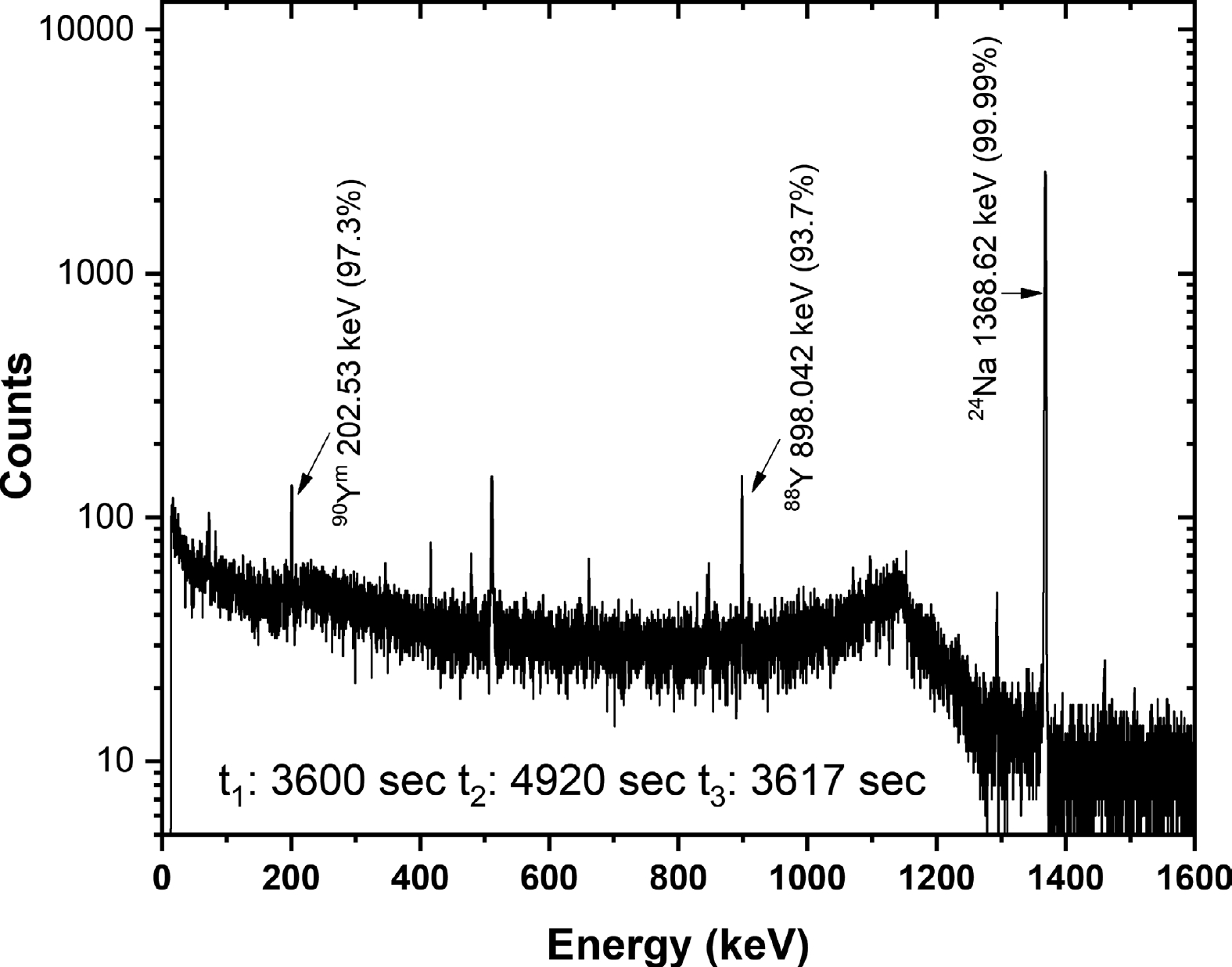 (%)Reference 69Znm 13.756 ± 0.018 hr IT (99.967%) 438.634 94.88 ± 0.07 [12] 68Cum 3.75 ± 0.05 min IT (86%) 526.44 74.8 ± 1.7 [13] 65Ni 2.5175 ± 0.0005 hr β− (100%) 1481.84 23.59 ± 0.14 [14] 67Cu 61.83 ± 0.12 hr β− (100%) 184.577 48.7 ± 0.3 [15] 66Cu 5.120 ± 0.014 min β− (100%) 1039.2 9.23 ± 0.09 [16] 65Zn 243.93 ± 0.09 days ec β+ (100%) 1115.539 50.04 ± 0.10 [14] 63Zn 38.47 ± 0.05 min ec β+ (100%) 669.62 8.2 ± 0.3 [17] 90Ym 3.19 ± 0.06 hr IT (99.9982%) 202.53 97.3 ± 0.04 [18] 88Y 106.626 ± 0.021 days ec β+ (100%) 898.042 93.7 ± 0.03 [19] 99Mo 65.924 ± 0.006 hr β− (100%) 181.068 6.05 ± 0.12 [20] 98Nbm 53.3 ± 0.4 min β− (99.9%) 722.626 73.8 ± 1.5 [21] 97Nbg 72.1 ± 0.7 min β− (100%) 657.23 98.23 ± 0.08 [22] 96Nb 23.35 ± 0.05 hr β− (100%) 568.871 58.0 ± 0.3 [23] 93Mom 6.85 ± 0.07 hr IT (99.88%) 263.049 57.4 ± 1.1 [24] 92Nbm 10.15 ± 0.02 days ec β+ (100%) 934.44 99.15 ± 0.04 [25] 89Zrm 4.161 ± 0.010 min IT (93.77%) 587.8 89.62 ± 0.17 [26] 89Zrg 78.41 ± 0.12 hr ec β+ (100%) 909.15 99.04 ± 0.03 [26] 27Mg 9.458±0.012 min β− (100%) 843.76 71.80±0.02 [27] 24Na 14.997±0.012 hr β− (100%) 1368.626 99.9936±0.0015 [28] Table 2. Decay data adopted in the present study.