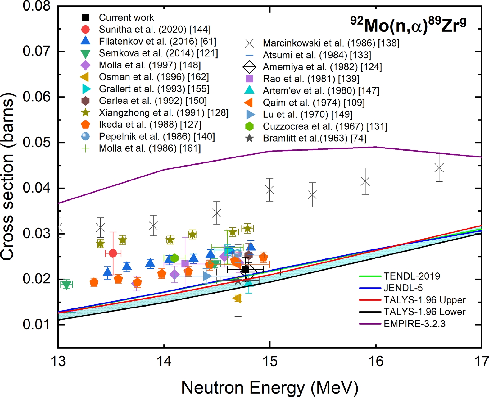 Figure 20 shows the measured cross section of the 92Mo(n, α)89Zrm reaction at a neutron energy of 14.77 ± 0.17 MeV compared with the experimental data from the EXFOR database, evaluated data from the TENDL-2019 and JENDL-5 libraries, and the TALYS-1.96 uncertainty calculations. The experimental data reported in Refs. [61, 72, 120, 124, 127, 139, 151, 160] were normalized with the IRDFF-II evaluation of the 27Al(n, α)24Na monitor reaction. The experimental data of Ref. [150] after normalization with the IRDFF-II evaluation of the 93Nb(n, 2n)92Nbm monitor changed by 2%.